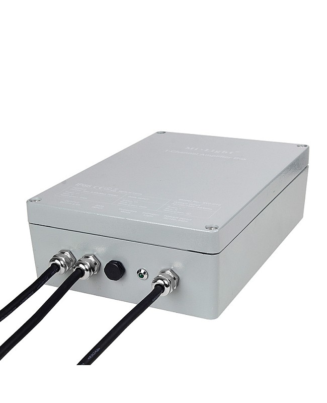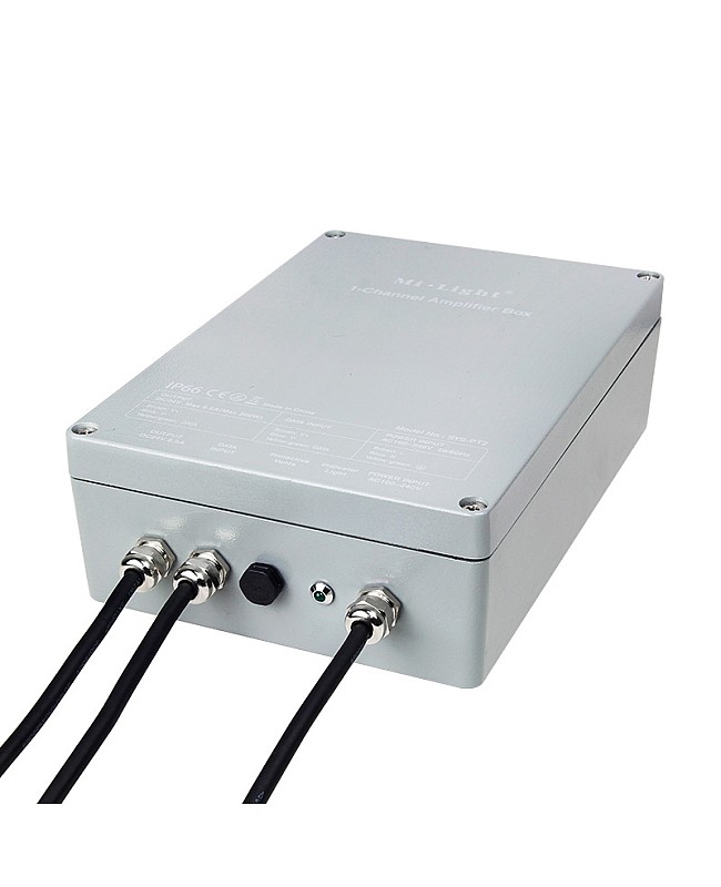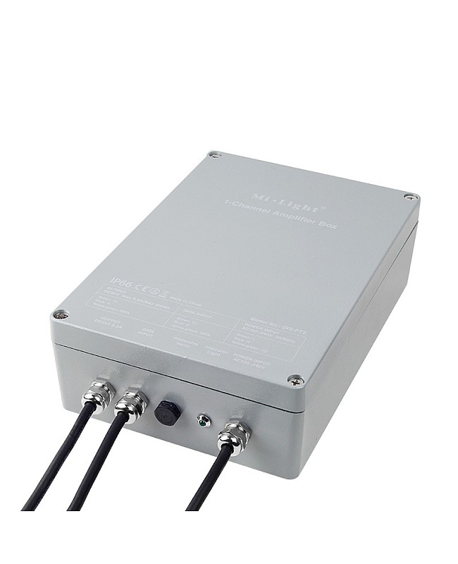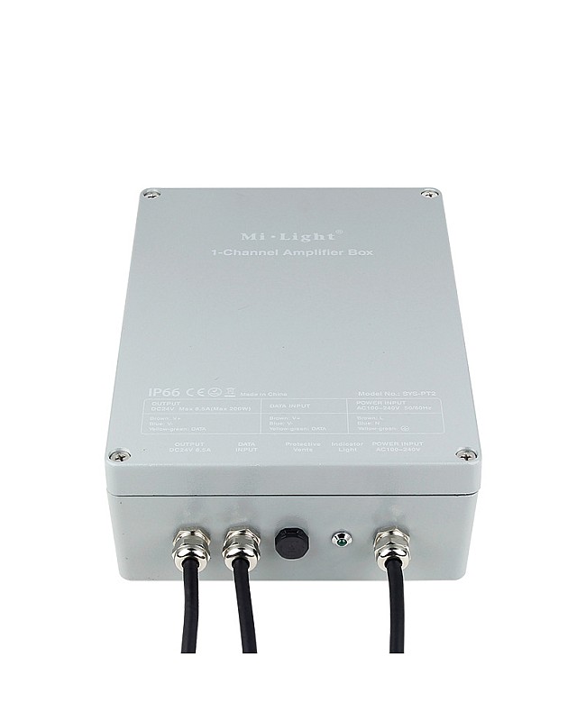 The MiBoxer SYS-PT2 1-channel amplifier box needs to work with the 1-channel control box SYS-PT1, compatible with MiBoxer SYS series products, which amplifies the power and signal for the "SYS-PT1" 1-channel host control box to connect more LED lamps and work synchronously. You can connect and control double quantity LED lights. The amplifier box has a high-quality stainless steel shell, corrosion resistance, and wind and rain protection. The amplifier box works on AC100V to AC240V, can connect to the public power system directly, the output voltage is DC24V, can work with 24V LED lights, will receive the signals from the control box, and send the data signals to the MiBoxer SYS lighting.