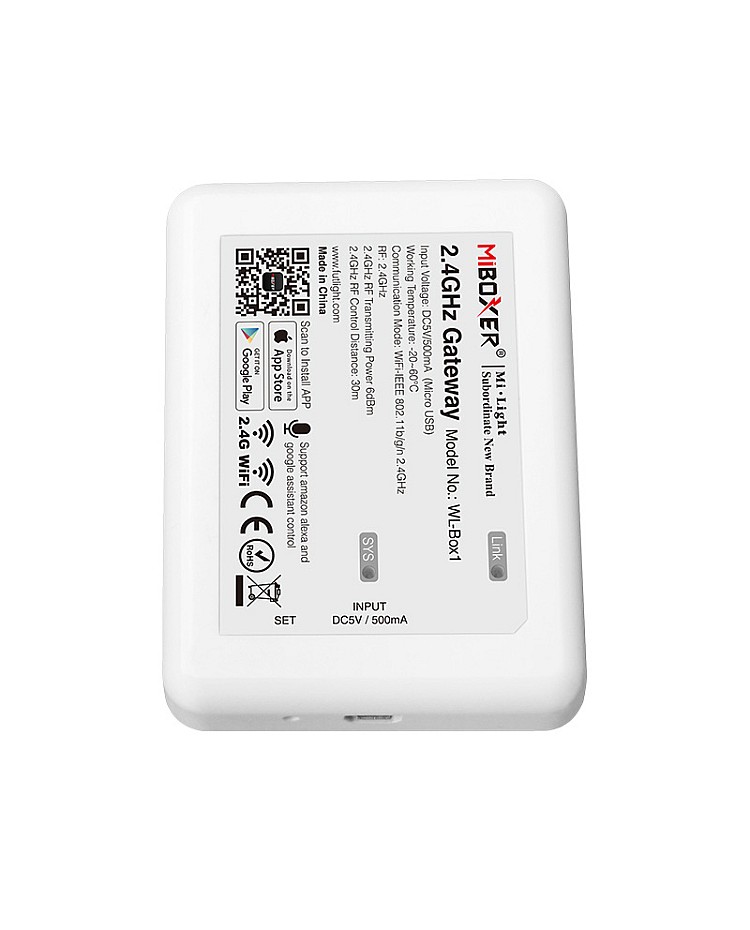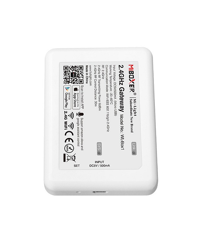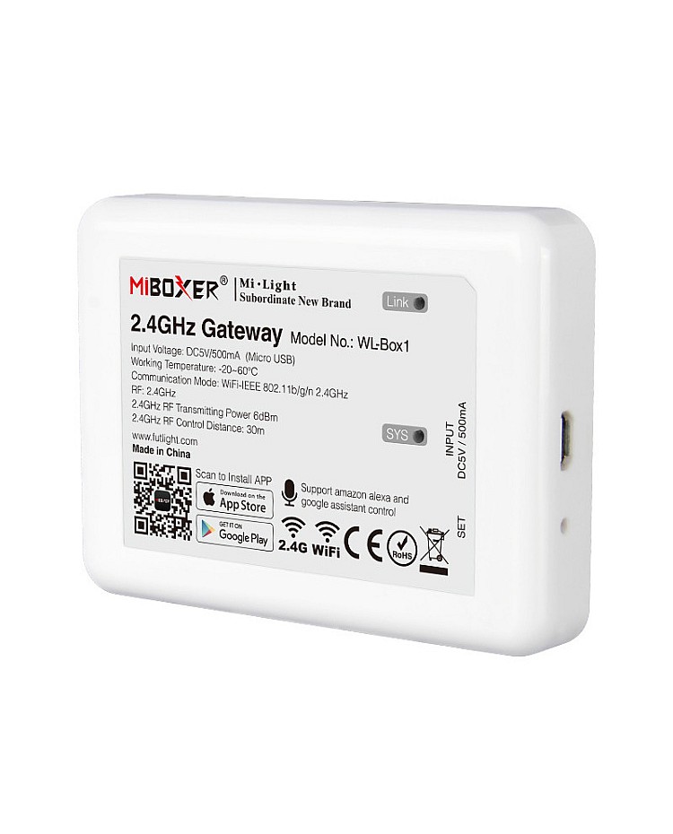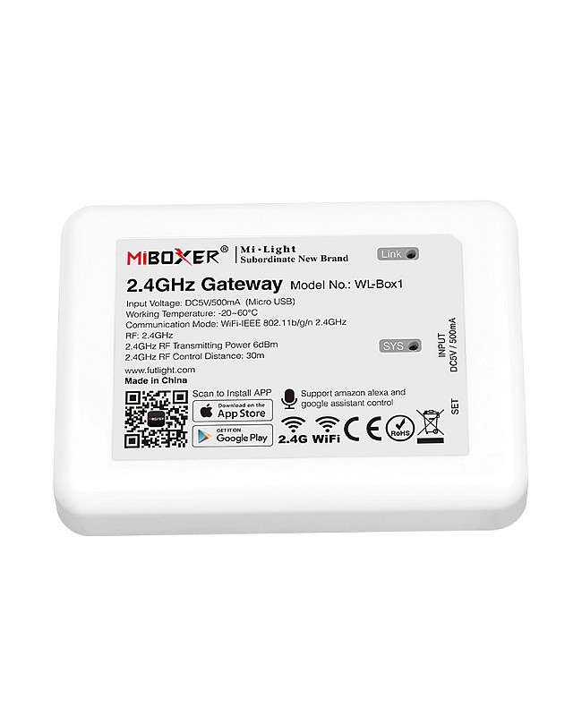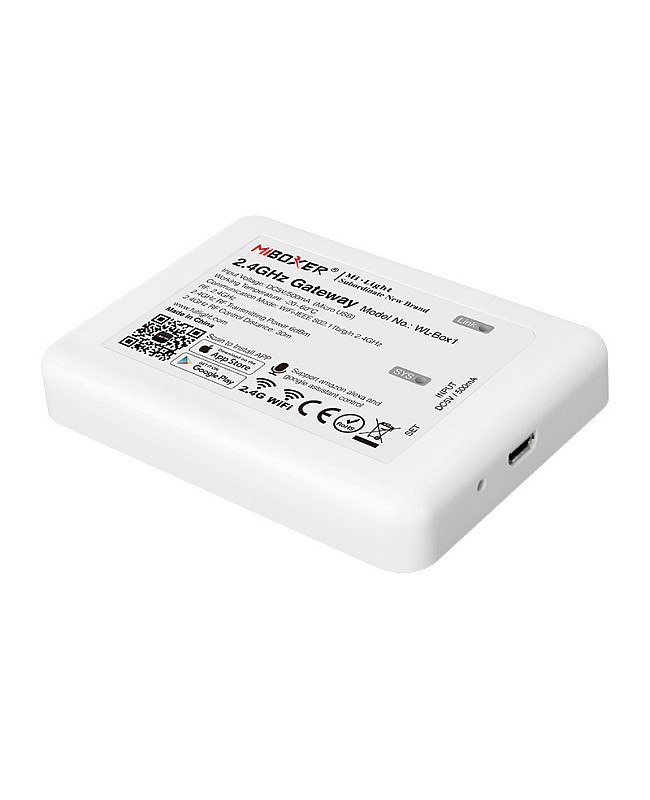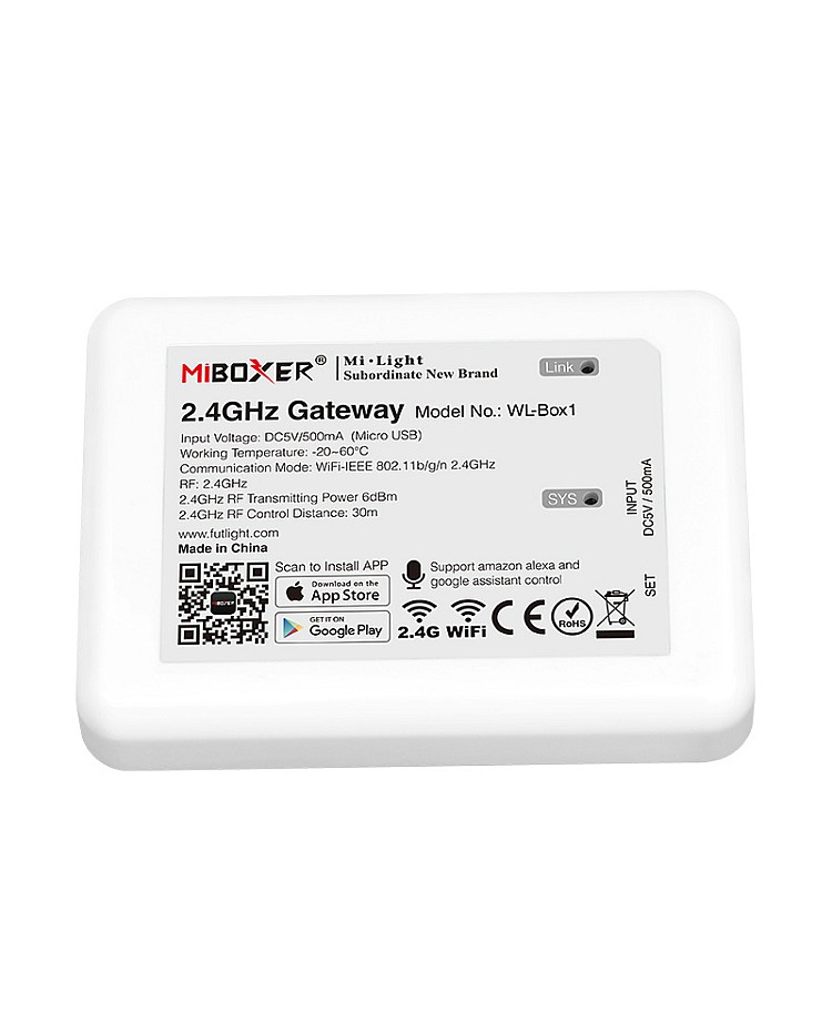 The MiBoxer WL-Box1 2.4G gateways are made of high-end PC material, with excellent electrical insulating properties, fire resistance, and chemical resistance, with strong heat and low-temperature resistance. It is compatible with the Mi-Light series and the MiBoxer series 2.4G products and supports third-party voice control, WiFi wireless control, and smartphone APP control. Under the voice control function, you can turn ON/OFF the LED light, adjust brightness and color temperature, and change the color through voice commands. The MiBoxer gateway supports Amazon Alexa and Google Assistant; the third-party voice function only controls the LED light linked to the selected remote control and does not support zone control. You can download the app and connect it to the remote control.