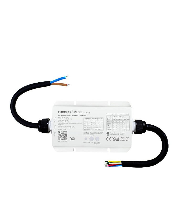 The MiBoxer WL5-WP waterproof RGB WiFi controller, with a 5-in-1 function design and an waterproof level is IP67, allows you to use it in a wet, damp, or water location for the single color, CCT, RGB, RGBW, and RGBWW LED strips. The WL5-WP has five output modes designed, and you can press the set button on the controller to change the output mode. The WiFi light controller has built-in 2.4G transmission technology, is compatible with 2.4G RF remote controls, and has a control distance of up to 30 meters. After adding the 2.4G gateway WL-BOX1, the Smartphone APP, and third-party voice commands can control the waterproof LED controller. You can set the static color or dynamic modes, and there are 16 million colors available, adjust the saturation, brightness, and color temperature(2700K-6500K). One controller will receive the signals and transmit them to others within 30 meters; all will work synchronously. The LED lights can be grouped through the mobile phone APP, or the remote control can control multiple LED lights simultaneously and independently for each group. Users can set the light on or off time according to their needs and manage their LED lights more easily.