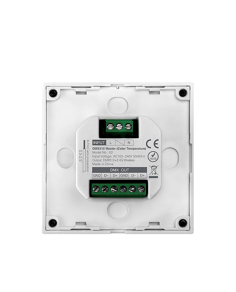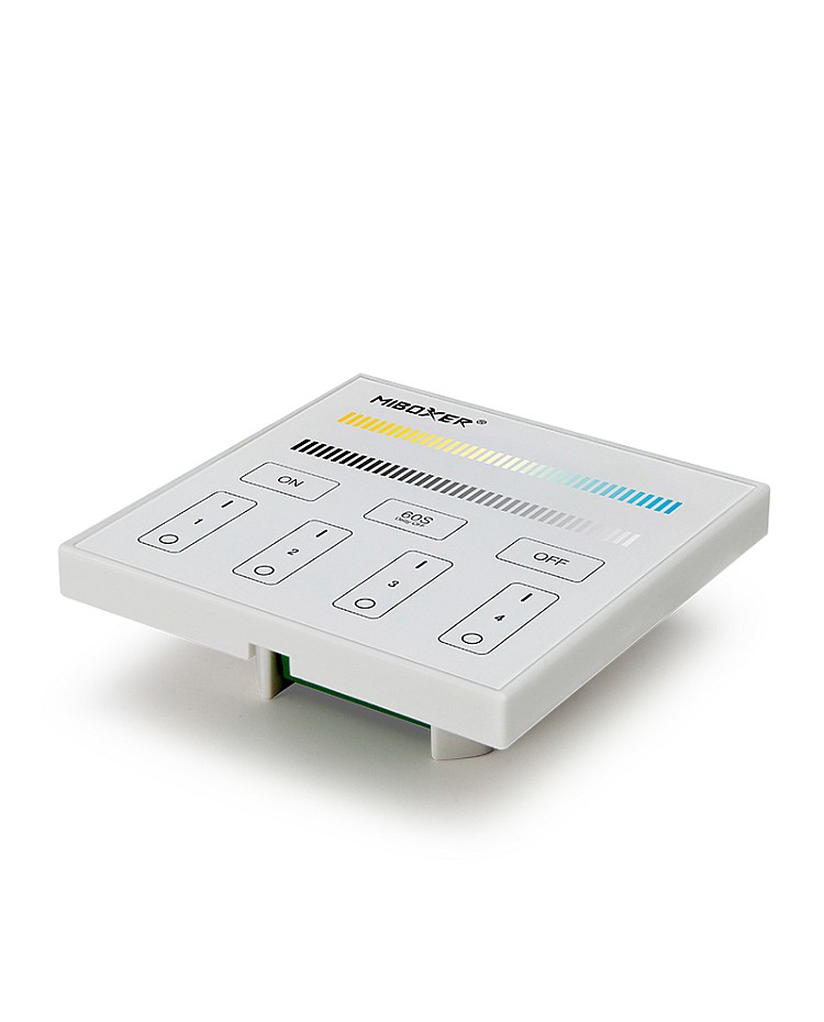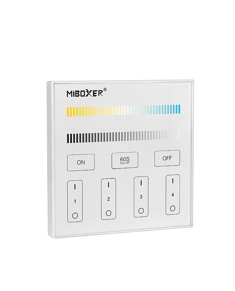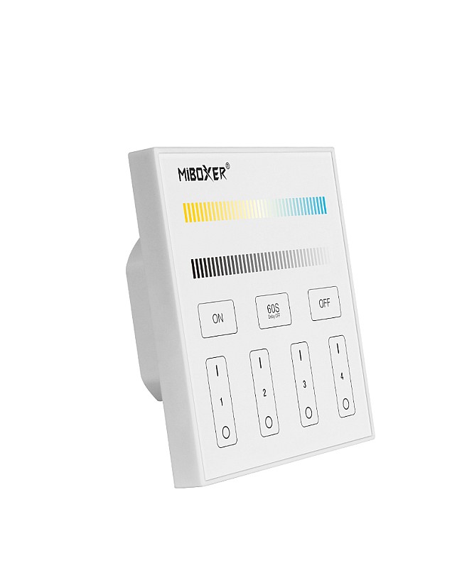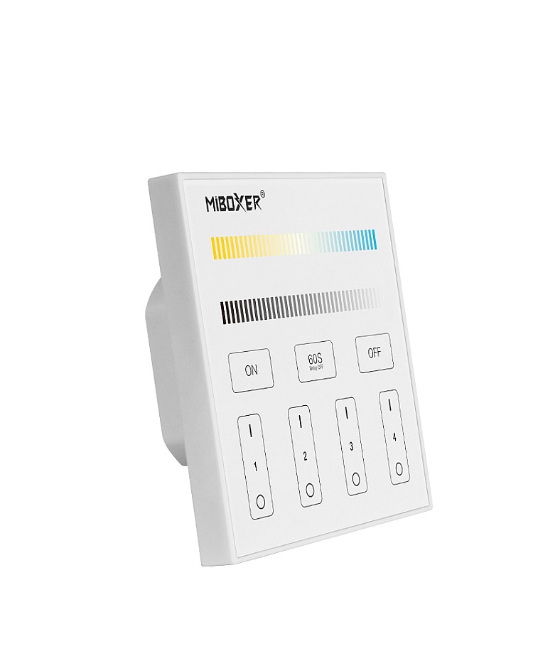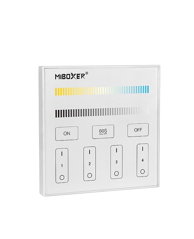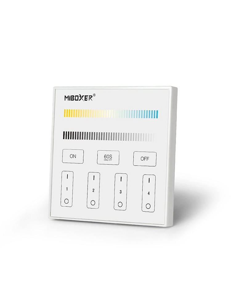 The MiBoxer X2 color temperature DMX LED strip controller with DMX512 signal output and wireless 2.4G signal output design, the DMX signal to control DMX512 Lamps and 2.4G signal to control MiBoxer 2.4G LED lights. The DMX LED controller with a standard European 86-type structure and sensitive touch panel design is easy to install and use. The indicator light will flash when touching the buttons and make different sounds. The MiBoxer X2 can be controlled by 2.4G remote controls and a smartphone APP after adding the WLBOX1 2.4G gateway. You can touch the sliders to adjust the color temperature from warm white to cool white and the brightness from 1% to 100%. There are 4 zones individually controlled design, and you can control each zone separately, with a 60-second delay OFF function by touching the button. The LED light will turn off automatically after 60 seconds.