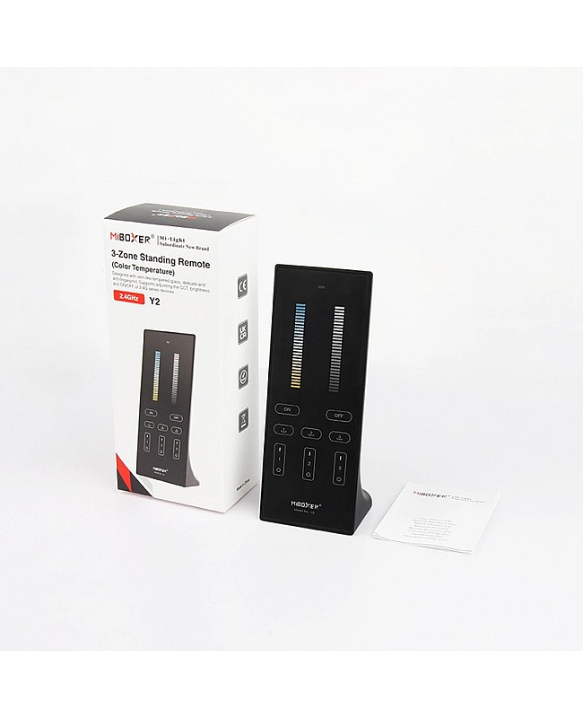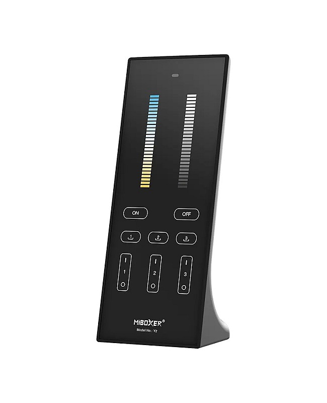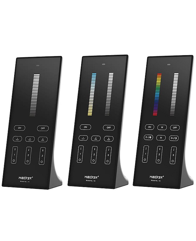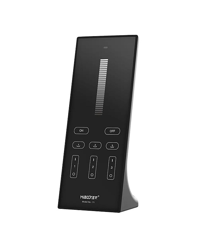 The MiBoxer Y series remotes have a vertical design, allowing them to stand on tables or cabinets to prevent loss. The surface has soft and matte touch glass, is scratch-resistant, and has no fingerprints. They adopt 2.4GHz wireless transmitting technology with fast speed and stable signal, with the best performance for anti-interference. This series have Y1, Y2, Y3 optional. You can choose Y1 for single-color LED lights, Y2 for tunable white lights, and Y3 for RGB+CCT. You can use the LED remotes to adjust brightness and color temperature and set colors for various scenes. They can work with MiBoxer or Milight 2.4G series controllers. Those light remotes have a 3-zone design and can work with multiple devices simultaneously.