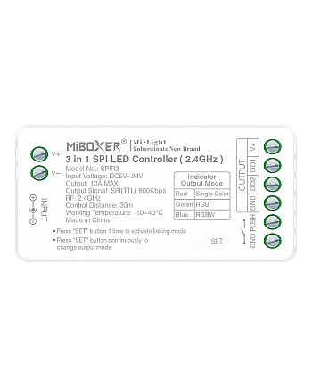 The MiBoxer SPIR3 is a 3-in-1 pixel controller designed for single color, RGB, and RGBW pixel strip ..