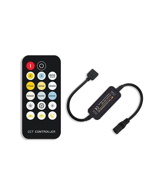 The Mini Inline CCT tunable white LED strip controller has a female DC connector and a 4-pin connector, making it easy to connect to the LED transformer and CCT LED strips. The CCT LED controller is small, allowing installation in a narrow or small location. With two output channels designed and a max output current of up to 3A for each channel, the 17-key RF remote control is included. You can use it to control the CCT LED light remotely, turn it on/off, and adjust the color temperature, static color brightness, and speed of dynamic modes. There are six static colors and six dynamic modes available. With the delay-off function, you can set the LED Light to turn off automatically after 60 seconds.