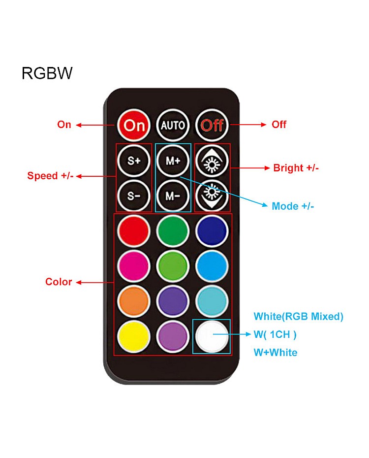 The LED RGB strip RF controller features a mini size and an inline design, allowing for easy installation in narrow or small spaces, such as under a cabinet or within furniture. Working with a voltage range of 5V to 24V, versions with 3 or 4 output channels are available for RGB or RGBW LED strip lights. The mini RGB LED controller boasts a female DC connector and 4-pin or 5-pin female LED connector, making it easy to connect to LED power supplies and LED strips. The 21 Keys RF remote control can set 12 static colors and 19 dynamic modes, with adjustable brightness for static colors and speed for dynamic modes.