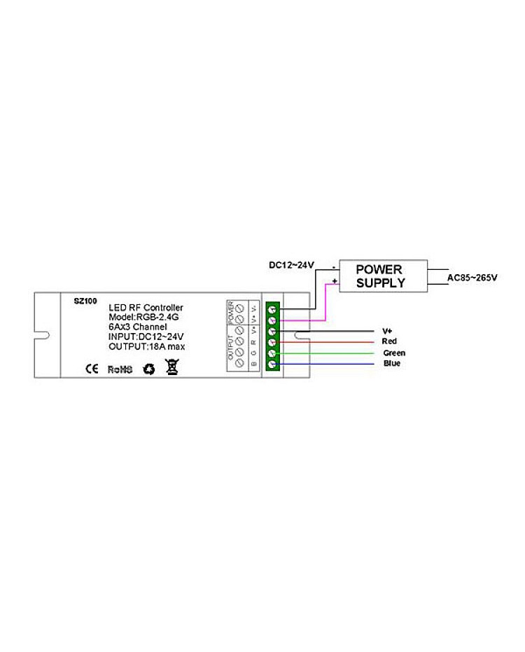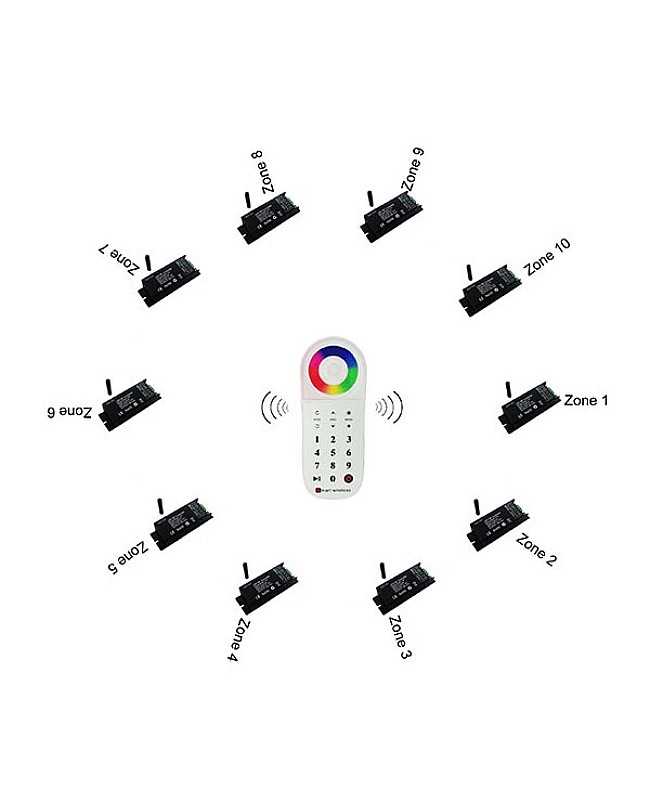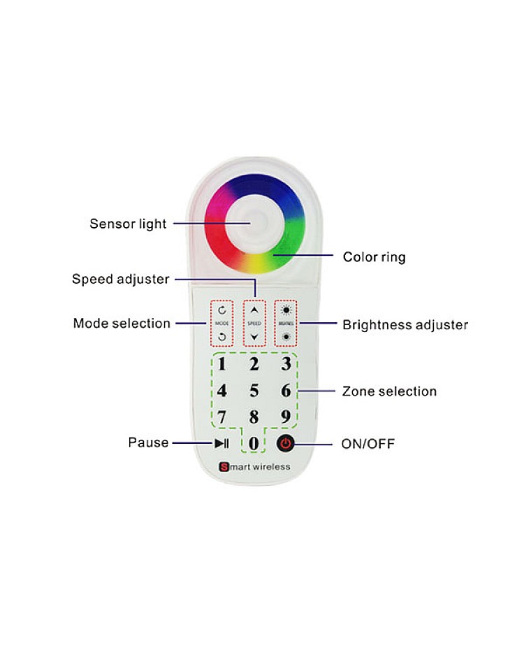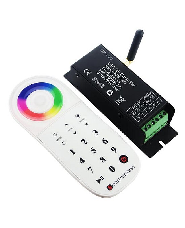 The multi-zone 2.4G RF RGB LED controllers include the RGB LED controller and RF remote control to achieve integrated control of multiple areas within the effective distance range, and meet the growing demands of LED lighting environmental control. Working on DC12V or DC24V, has a 3-output channel design, the max output current of each channel up to 6A, and the max loading power up to 432W when working in 24V. You can use them for the RGB LED strips, color-changing LED modules, LED string lights, or other color LED lights. The 18-key RF remote control is included to achieve independent control for up to 10 areas, including switching, pause, speed, and brightness adjustment. You can adjust the color conveniently by pressing the color ring.