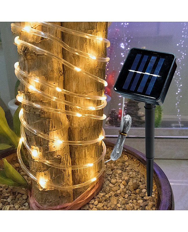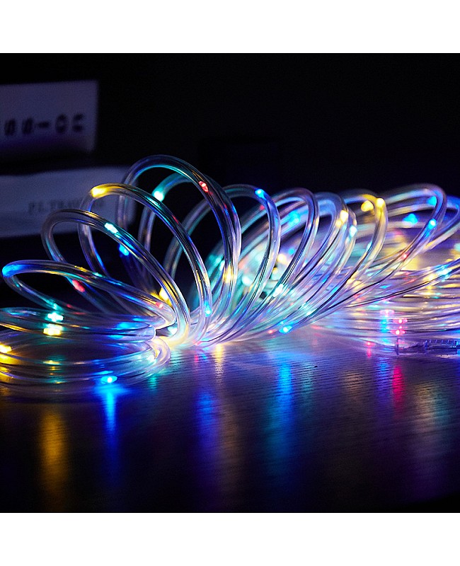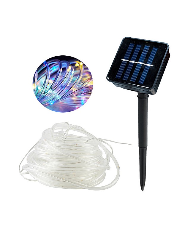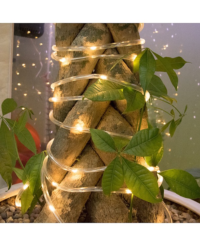 The solar rope light outdoor uses high-quality San An LEDs as the light source, which are sealed in a clear PVC tube. The waterproof level is IP65; you can install them for indoor and outdoor lighting projects. Various LEDs and various length products are available, and you can choose 50PCS LEDs or 100PCS LEDs, 5 meters or 10 meters for multiple needs. There are 3 emitting color products available: warm white, cool white, and RGBY(Red, Green, Blue, Yellow). The solar panel and rechargeable NI-MH battery will be charged under daylight sunshine and will power the rope light at night automatically. There are 2 physical buttons on the back of the solar panel, one to turn on or off the LED light, and the other to choose the working mode from steady on or flash. The solar rope lighting with low-heat LEDs, super flexible and easy to mold into any shape for your lighting project, you can wrap them around the trees, balconies, furniture, windows, stairs, etc for indoor and outdoor decoration in festivals, weddings, parties and other scenes, it works at low voltage, safe to kids and pets. You can use them for a garden, yard, patio, trees, curtains, decks, path, etc.