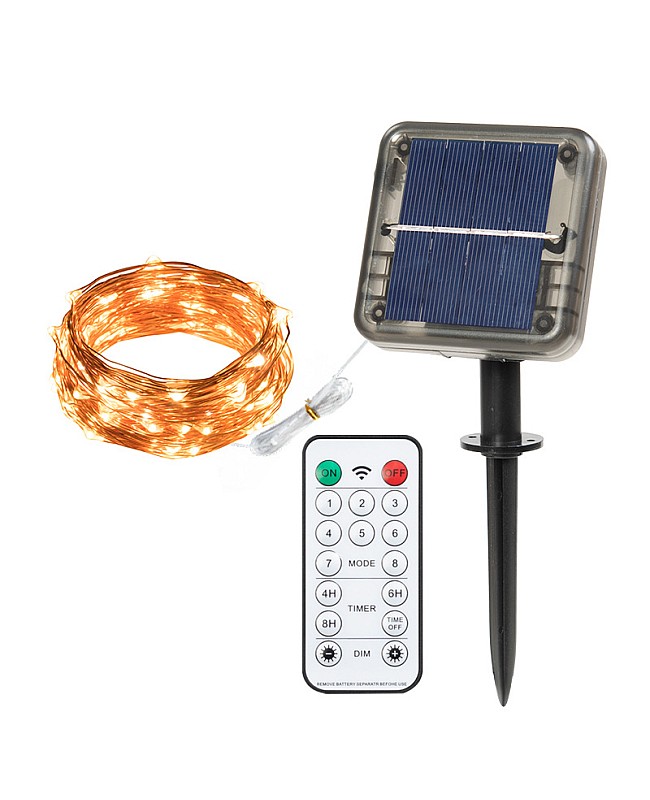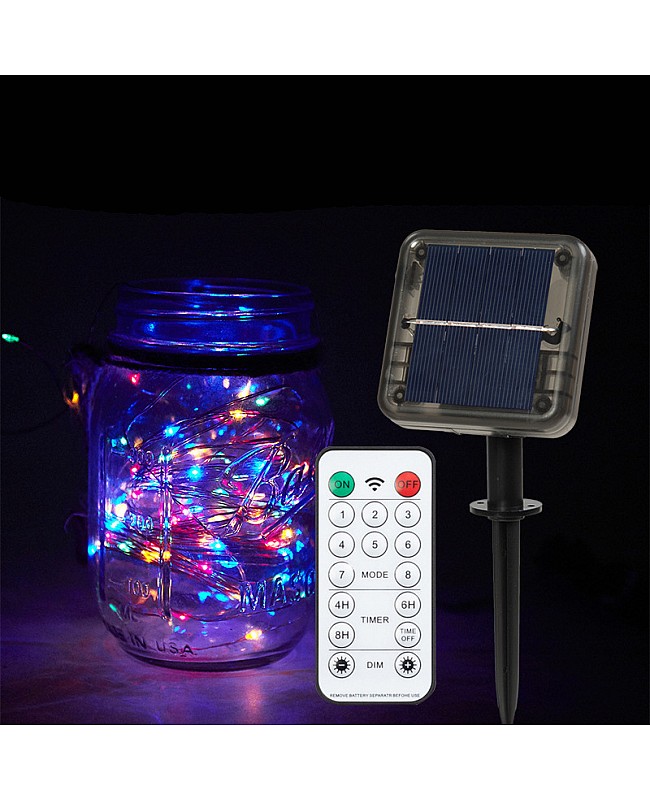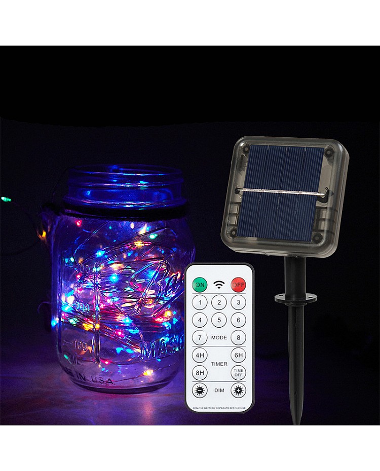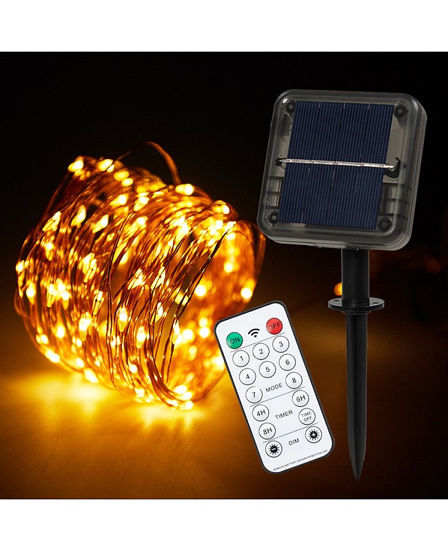 The outdoor solar fairy string lights use 0603 LEDs as the light source, have low power consumption, and have a longer lifespan. Various length products are available: 10- and 20-meter lengths, with 100PCS LEDs or 200PCS LEDs. You can choose from the various emitting color products, from single-color to multi-color. The solar panel and rechargeable battery are included. The battery will be charged under the sunshine in the daylight and will light up the LED string lights at night. The fully charged time is only 7-8 hours, and the discharging time is over 12 hours. The 16-key remote control is included. You can use it to turn ON/OFF the LED fairy lights, set the dynamic modes and working time, and adjust the brightness. There are 8 dynamic modes and three timing modes available. The inserted pole is included; you can insert it into the ground or mount it on the wall. The waterproof level is IP65; you can use them indoors and outdoors. The remote control solar lights can be used in gardens, lawns, patios, yards, etc.