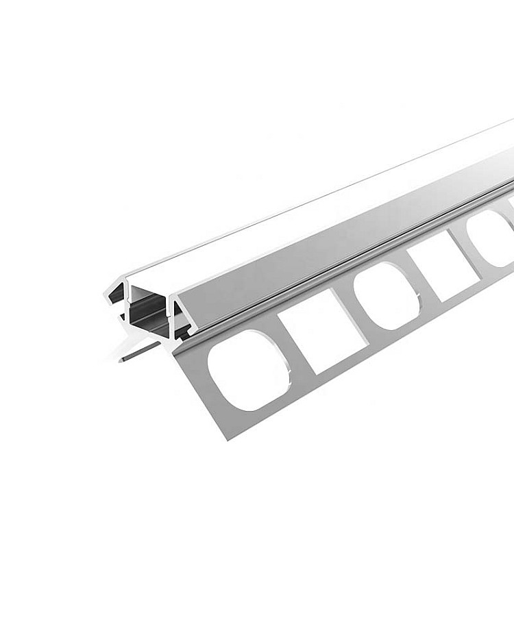The LED profiles are designed for 90-degree external corners in marble, stone, or tile installations. They can be integrated seamlessly into marble tile joints to create a sleek and durable lighting accent at outside edges. The tile corner light channels are crafted from high-quality extruded aluminum material and feature anodized surface treatment for anti-oxidation resistance, and provide excellent heat dissipation for LED strips while offering structural edge protection for stone surfaces. Ideal for kitchens, bathrooms, and commercial interiors. The stock lengths are 1 m and 2 m, and custom lengths are supported. Only one type of diffuser is available: the PC diffused cover, which is made of brand material, is anti-yellowing, has perfect light distribution, and delivers smooth, glare-free illumination. The inner width is 10.5 mm, allowing the maximum width to be 10 mm. We recommend adding COB strip lights as the light source, with no visible light dots, to create a seamless light line. End caps with and without wire holes are included.