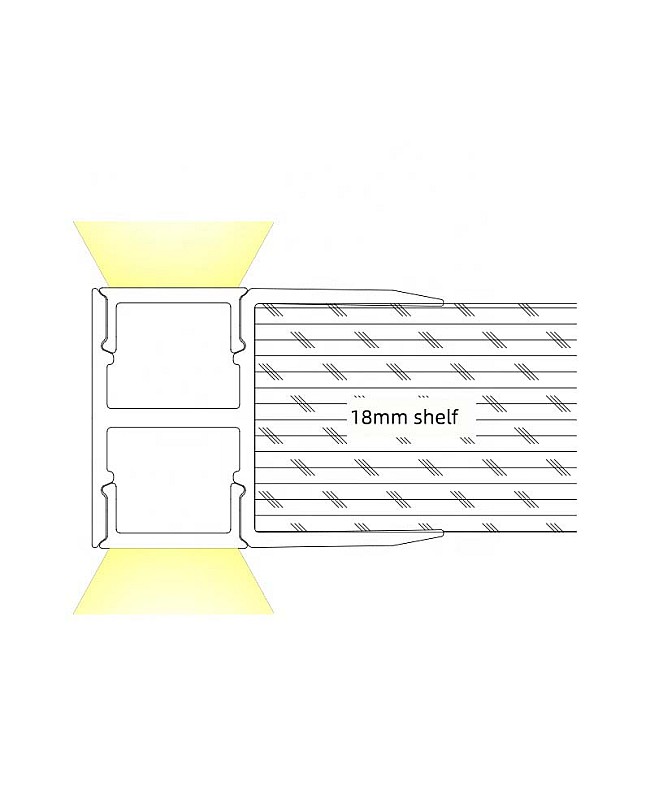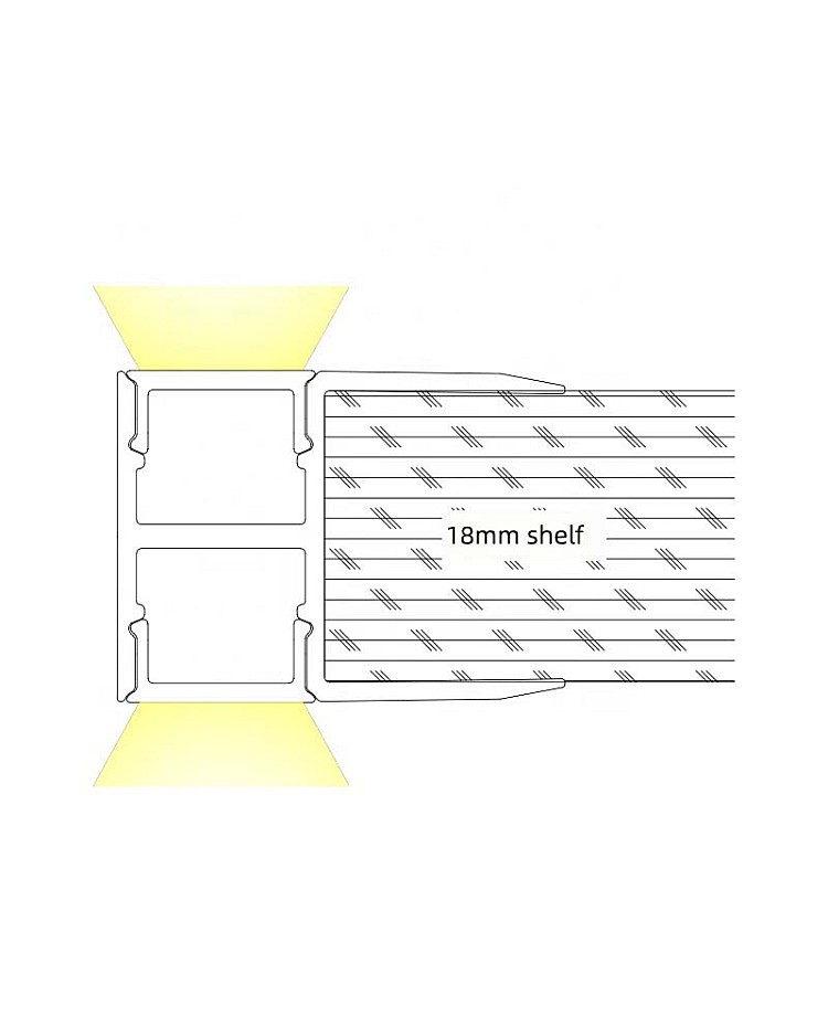 The recessed LED extrusion is designed specifically for an 18mm shelf board with up and down lighting design, delivering both functional and decorative illumination. The dual-channel design allows light to project upward and downward simultaneously, creating a balanced ambient glow and task lighting effect. The diffusers will diffuse the lighting evenly to create a cozy illumination. It's a perfect choice for modern kitchens, wardrobes, display units, and commercial shelving applications. The shelf edge LED channels are crafted from high-quality extruded aluminum material and have anodized surface treatment for anti-oxidation resistance and a longer lifespan. The stock lengths are 1 m and 2 m, and can be cut to your desired length easily. The inner width is 10 mm, allowing for a maximum width of strip lights of 10 mm. You can add our high-density COB strip lights as the light source for uniform lighting without hotspots. The aluminum channels can work as heat sinks for better heat dissipation to extend the lifespan of LED lighting. Only PC diffused covers are available, they will diffuse the lighting evenly for unifrom and glare-free illumination. The end caps and diffused covers are included, no need to order serparately.