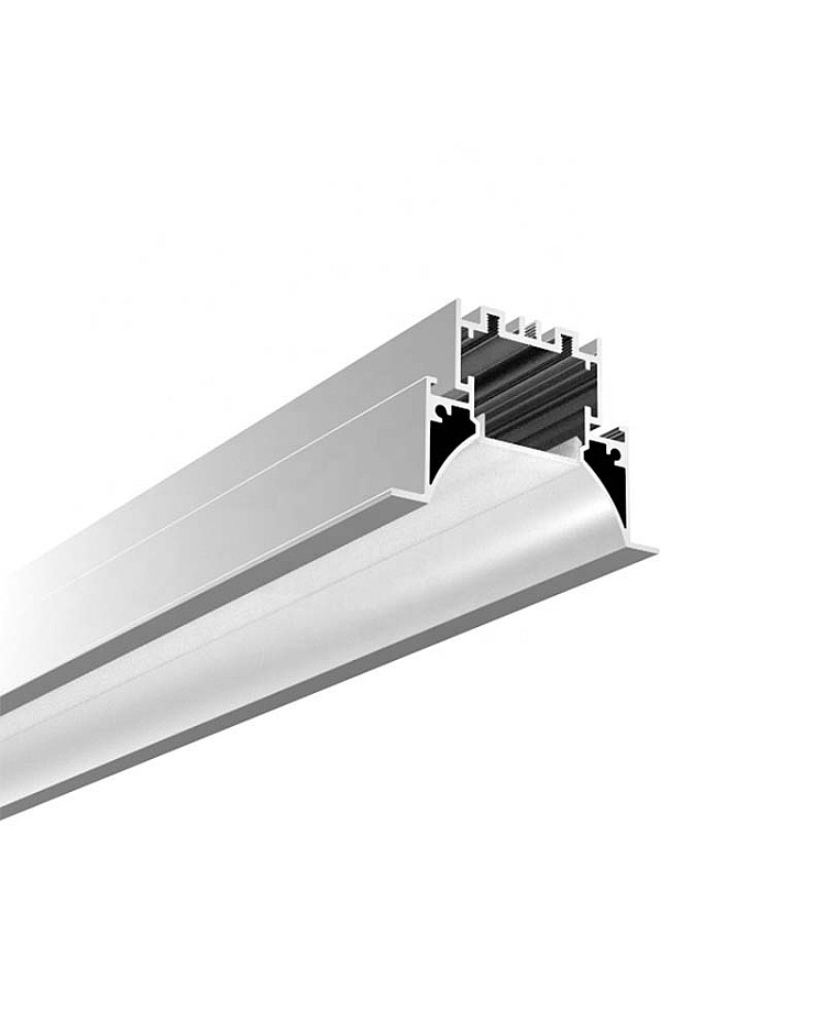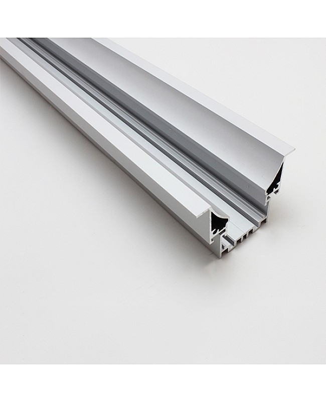 The 2-inch recessed-mounted LED strip channel with regressed cover can be mounted into the ceiling or wall, with the cover flush with the surrounding surface. The cover helps to direct the light downward, providing a soft, even lighting effect. The LED channels are made of 6063-T5 aluminum alloy with a silver anodized surface, providing durability and a longer lifespan. The standard length is 1M, and the maximum length is 2.5m per piece; it can be cut to any size that fits your project. The 180° connector is sold separately; you could connect LED channels for long runs. Only one type of LED light diffuser is available: the PC Frosted cover, made from Japan-brand material with stable quality, anti-yellowing, and a perfect light distribution for soft light output. The inner width is 27.4mm, allowing a maximum strip light width of 27mm. We recommend adding dual rows of high-density COB strip lights as the light source, providing bright, even, and seamless lighting. The lighting profile can serve as a heat sink to improve heat dissipation, extending the lifespan of LED strips. The aluminum end caps with wire holes and spring clips are included, allowing the recessed mounting on the ceilings or walls in offices, bars, hospitals, supermarkets, etc.