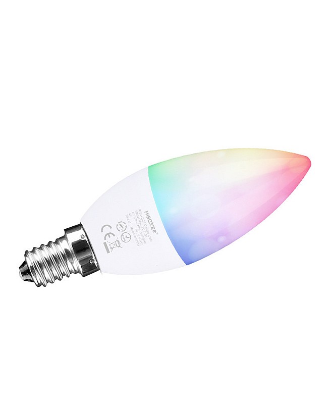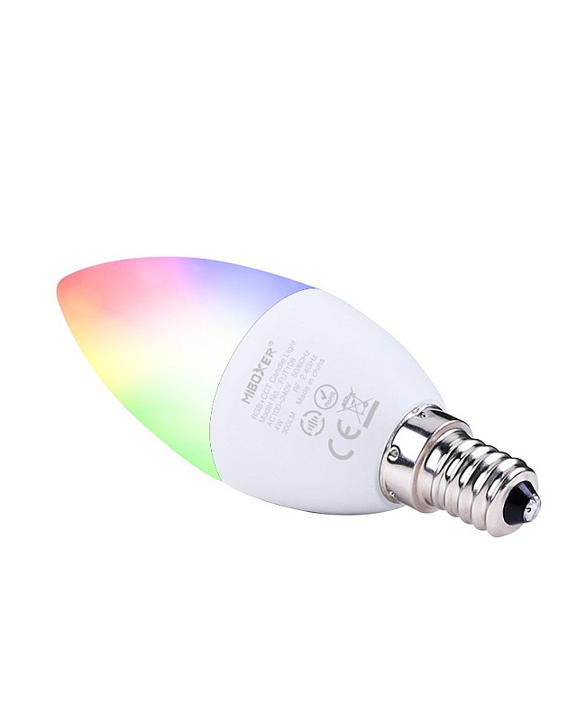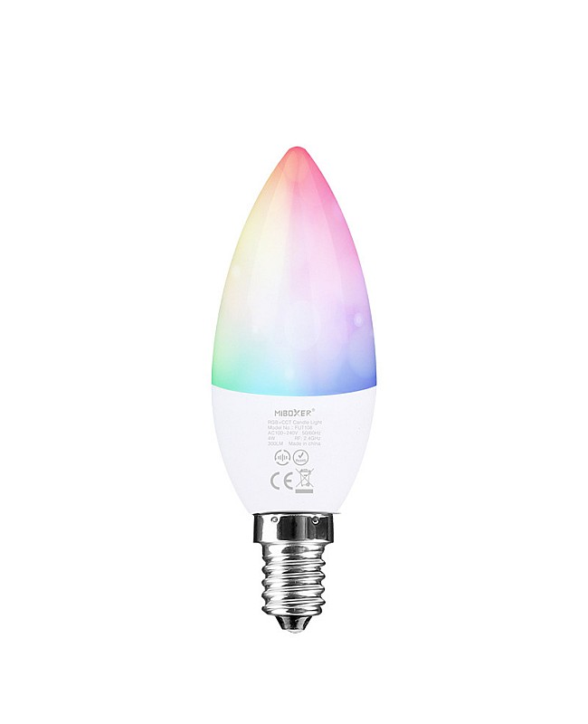 The MiBoxer FUT108 RGBWW LED candle bulb has an E14 base with aluminum housing for fast heat dissipation and a PC lens for high light transmittance. The working voltage from AC100V to AC240V can be directly connected to the public power system and replaced with the traditional lamps with an E14 base. Compatible with MiBoxer RGB+CCT RF remote controls to adjust the colors, saturation, color temperature, and brightness. There are 16 million colors and saturation changes to meet various scenes, and the color temperature is adjustable from warm white(2700K) to cool white(6500K). The MiBoxer 4W candle bulb supports smartphone apps and third-party voice control after adding a 2.4G gateway, which supports Amazon Alexa and Google Assistant voice commands. The E14 bulbs will receive signals from the remote controls or the app and transmit to other candle lamps within 30m, and different candle lights can work synchronously when they are started at various times. Group the lamps with a remote or app; each zone is controlled independently. Using a smartphone, you can also use the 4G network to control the candle bulbs from any place and at any time.