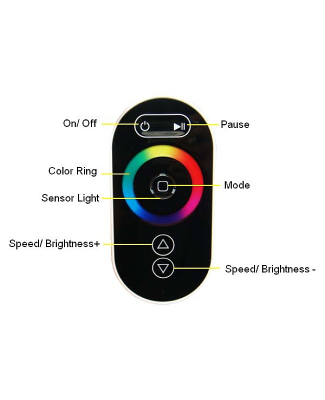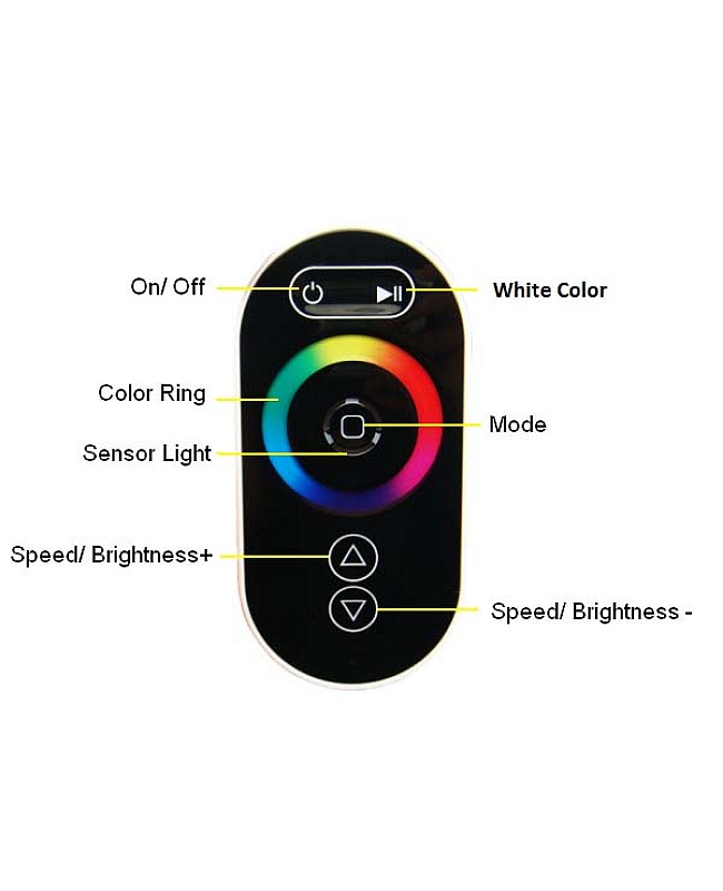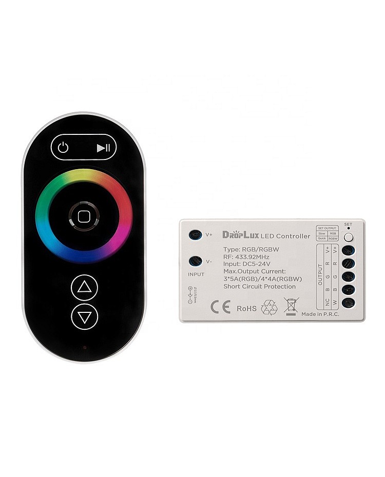 The RF wireless RGB RGBW 2 IN 1 LED controller 12V comes with a wireless LED touch remote control. The LED controller is designed for the constant voltage LED lights, with 2 1 functions for RGB or RGBW LED lights. The working voltage between DC5V and DC24V can work with LED strips, point source light, and wall washer lamp. With 3 or 4 output channels for RGB or RGBW LED lights, the max output current is 5A in RGB mode or 4A in RGBW mode. The memory function will store the power-off setting automatically. It comes with the wireless RF touch remote control, with a maximum control distance of up to 20 meters. You can use the Set button on the receiver to set the output type. The indicator flashes slowly, which means for RGB output; if it flashes quickly, it means RGBW. The RF touch control with one color ring and 5 function buttons, without any operation for more than 20 seconds, the touch remote will enter sleep mode. You can shake the remote to wake it up. You can use the RF remote control to adjust the brightness of static colors or the speed of dynamic modes. There are 10 modes in total.