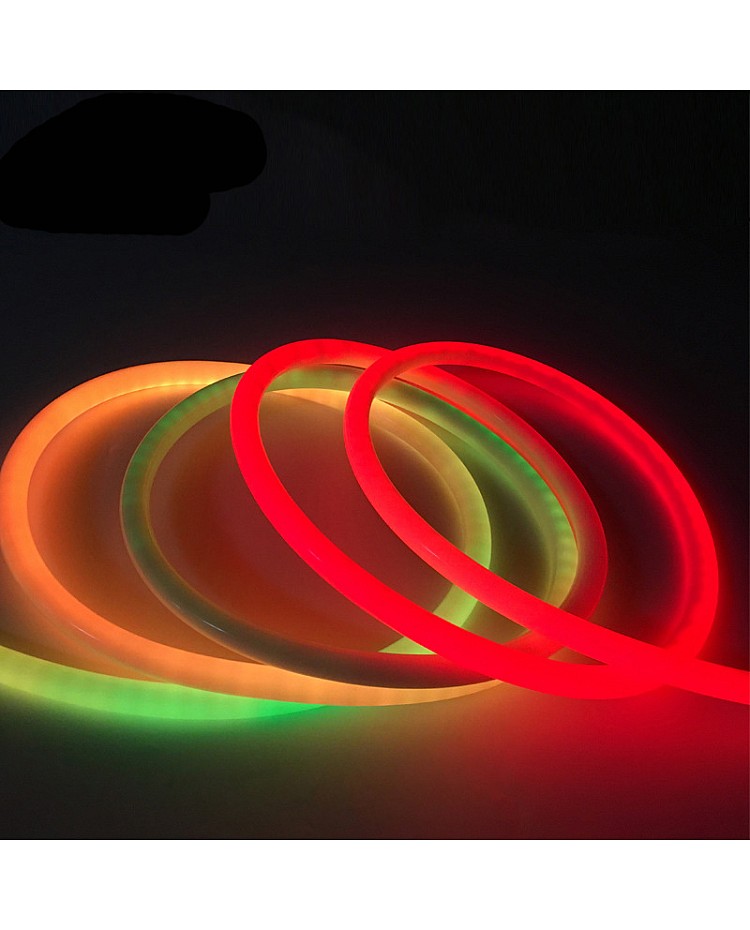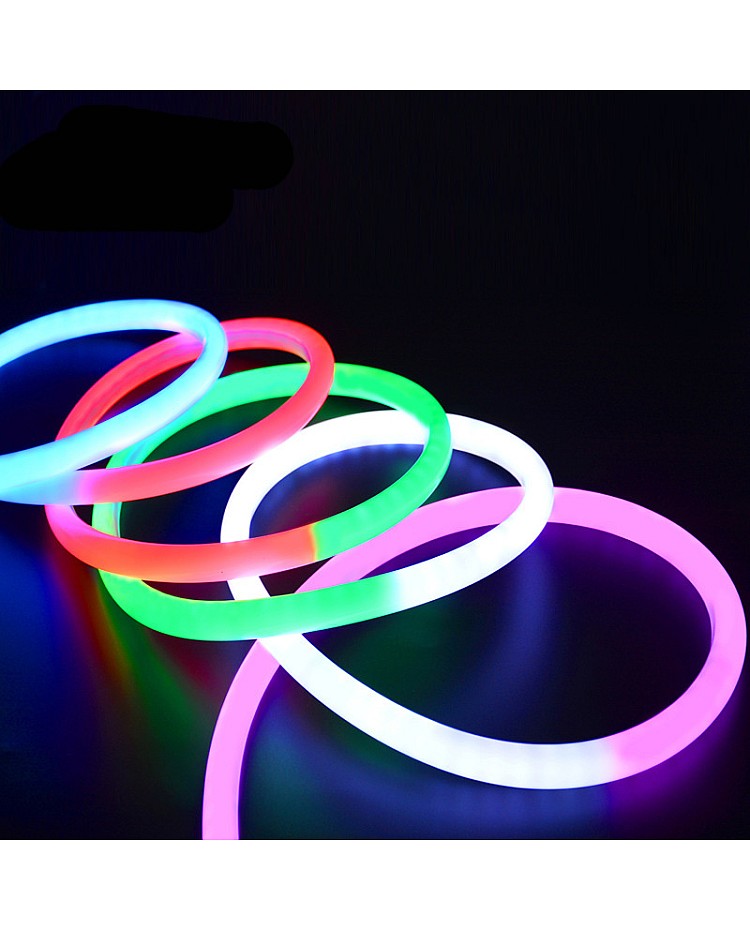 The round digital neon light strips have a diameter of 19mm and are 5 meters long per piece. The high-quality 3838 RGB SMD LEDs are mounted on the dual-layer PCB board and sealed in silicone rubber sleeves. The waterproof level reaches IP68, and you can use them for outdoor decoration projects in wet or water locations. You can cut to various lengths from the cutting marks and reconnect them to the controller. The addressable neon light strips have 72 LEDs per meter, and the 16703 IC controls every 3 LEDs to achieve a million colors and a hundred dynamic modes. easy to connect to the digital LED controller to achieve many amazing lighting effects, like chasing, rainbow, meteor, fire, etc. 256 brightness levels are adjustable. The round neon light strips have a 360° beam angle, no visible light dots, and a dark area. The silicon outer shell allows them to be bent, and you can use them to DIY various neon light signs for indoor and outdoor applications.