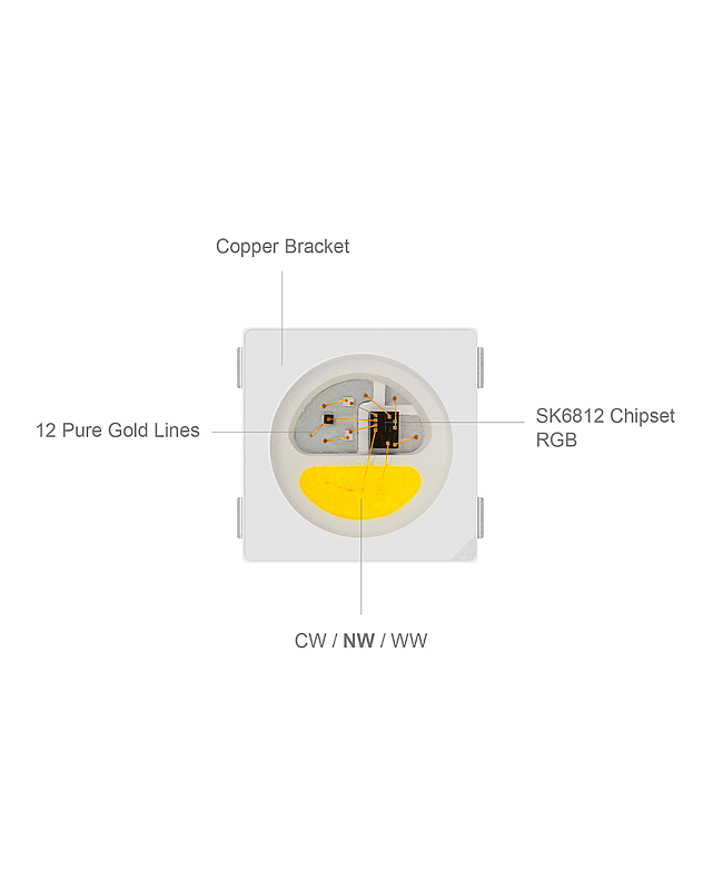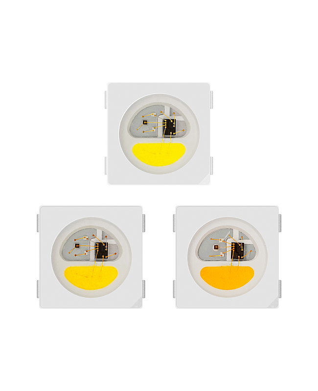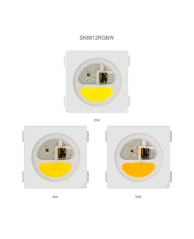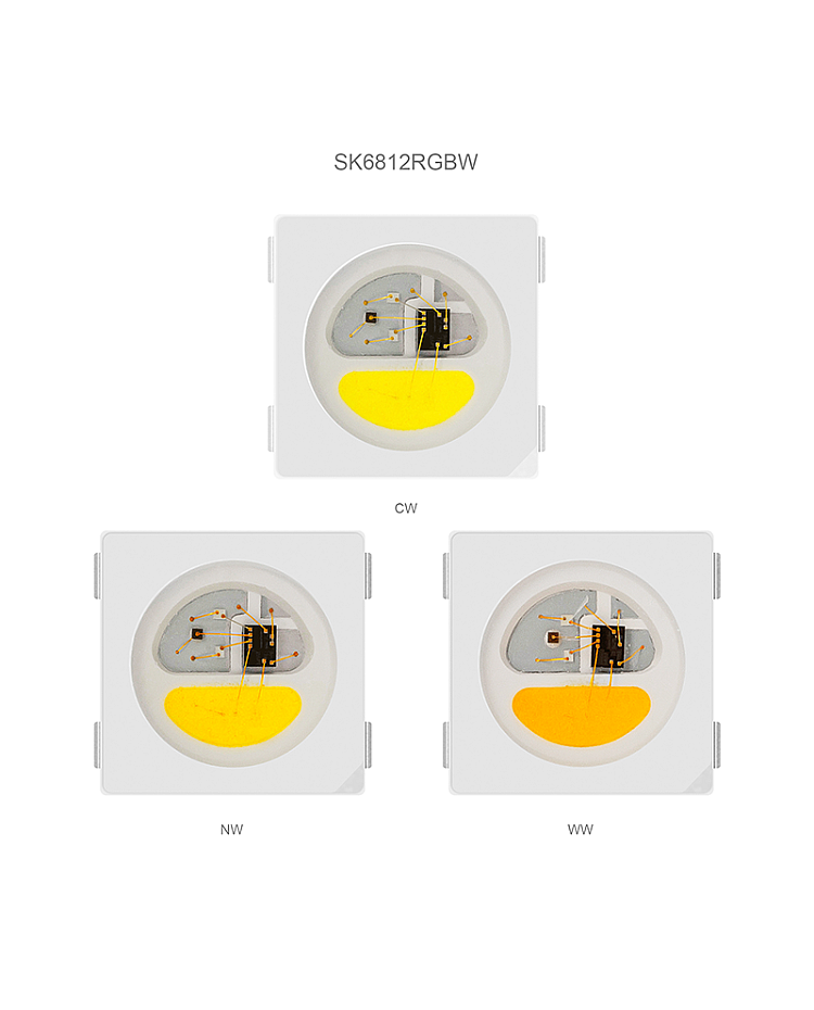 The SK6812 RGBW replacement SMD LED chips built-in SK6812 IC, the SMD LEDs not just include the red, blue, and green LED chips, but also add the White LED chips, you could choose warm white, natural white, and cool white for various scenes. This compact SMD LED blends your four source colors while reducing hot spots, glare, and shadows. The red, green, and blue chips have 630nm, 525nm, 470nm, and color temperatures from 2700K to 7000 K. The SMD LEDs emit a wide 120° viewing angle. You can use them to replace the broken LEDs on the LED lights or for DIY lighting projects.
