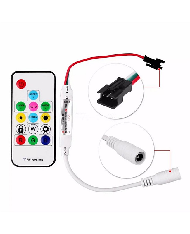 The SP103E programmable RGB LED controller has a mini size and an inline design, and comes with a 14-key RF remote control that is easy to install and use. The programmable RGB controller supports almost one-wire or two-wire smart ICs like WS2812B, WS2811, SK6812, and APA102, working in DC5V and with 300 lighting effects to meet the various scenes. Each controller can load a maximum of 2048 pieces of ICs. The brightness and speed of dynamic modes are adjustable, with memory function, and will retain the setting of the last time it was powered off. The SP103E with a female DC connector and 3PIN JST SM connector easily connects to the power supply and smart SMD LED strips.