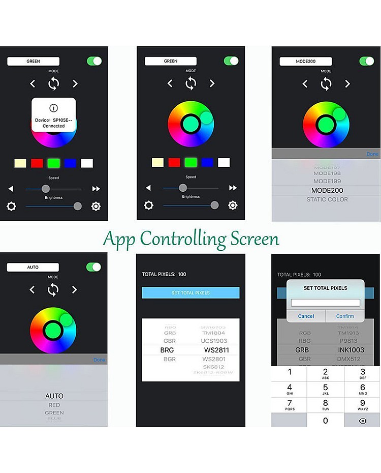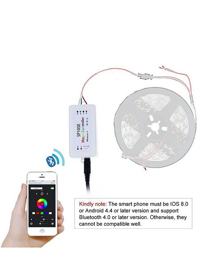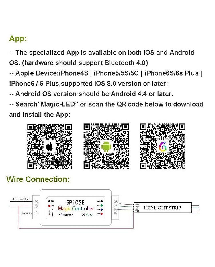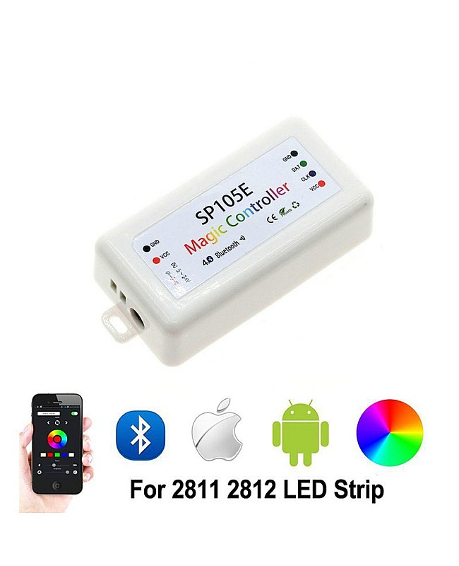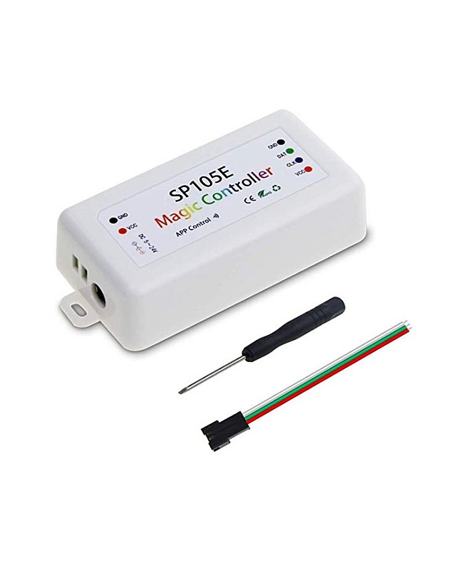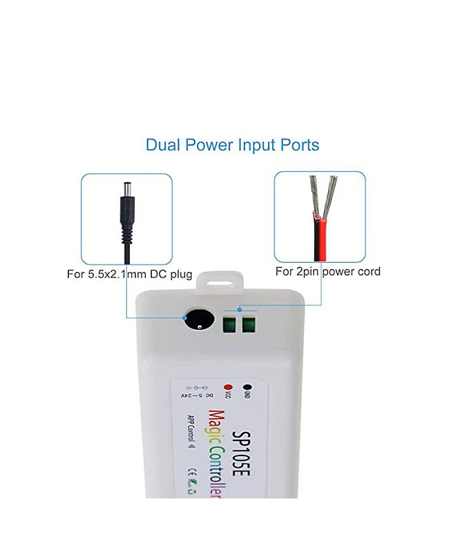 The SP105E Bluetooth SPI LED controller is an excellent choice for controlling addressable strip lights. This controller allows you to program and customize your lighting effects with various preset patterns and settings, which is compatible with a wide range of addressable LED strips and widely supports almost most smart IC, one-wire and two-wire LED driver smart ICs, like WS2811, WS2812B, WS2815, WS2814, WS2801, SK9822, SK6812, SK6812-RGBW, WS2813, APA102, APA105, TM1804, TM1814, TM1914, TM1913, P9813, INK1003, UCS1903, DMX512, LPD6803, LPD8806, and many more. Supports 5VDC, 12V, and 24V magic LED strips, with SPI output signal design, can set the light effects through mobile phones by connecting through Bluetooth 4.0 or later version to the controller, support Android 4.4 and IOS 8.0 or later version, you can scan the QR code on the controller to download the APP or search the APP name "Magic-LED" from APP stores, you can use the APP to set the dynamic mode or static color, adjust the brightness and color changing speed. When the app color is inconsistent with the color of the LED strips, you can use the APP to change the color order, RGB, RBG, BRG, BGR, GRB, and GBR available. The pixel LED controller can control up to 2048 pieces of ICs. More than 200 color change modes and static color modes are available. The color-changing speed and brightness of addressable LED strip lights are adjustable, and the user settings will be saved automatically when the power is off.