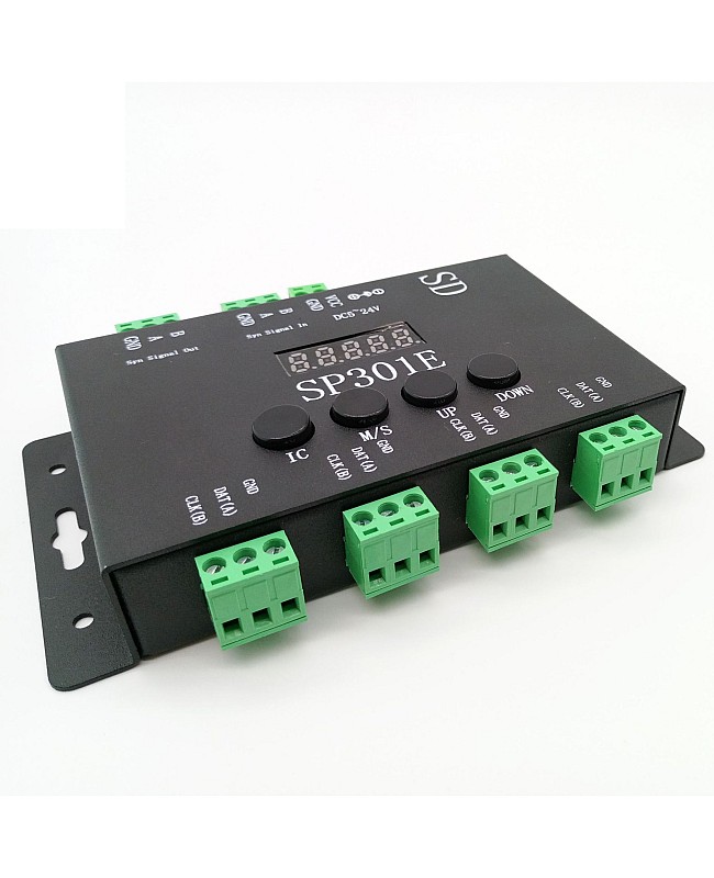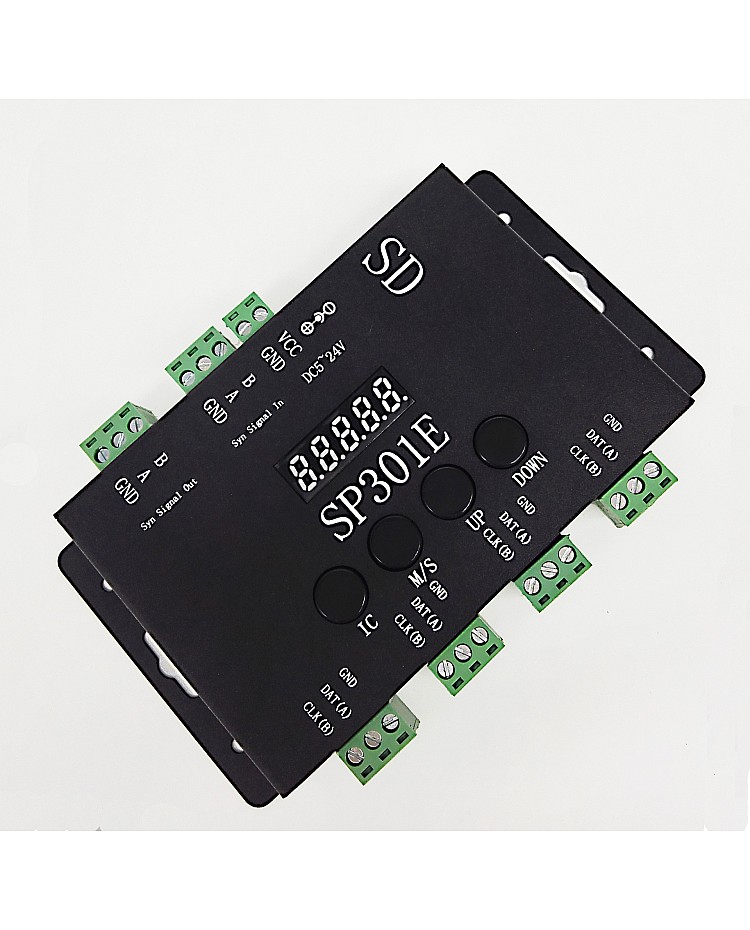 The SP301 programmable LED controller with four output channels is designed to support an SD card. You can edit the animation file and store it on the SD card. The SP301E pixel controller also has 99 built-in lighting patterns, and you can choose various lighting effects for different scenes. The programmable controller supports various working voltages from DC5V to DC24V and must connect the GNDs. The controller has four buttons; you can use them to choose the IC type, pattern setting, and speed setting. the SP301E controller supports almost one-wire or two-wire LED driver ICs like WS2812B, WS2811, SK6812, LPD8806, DMX512, etc.