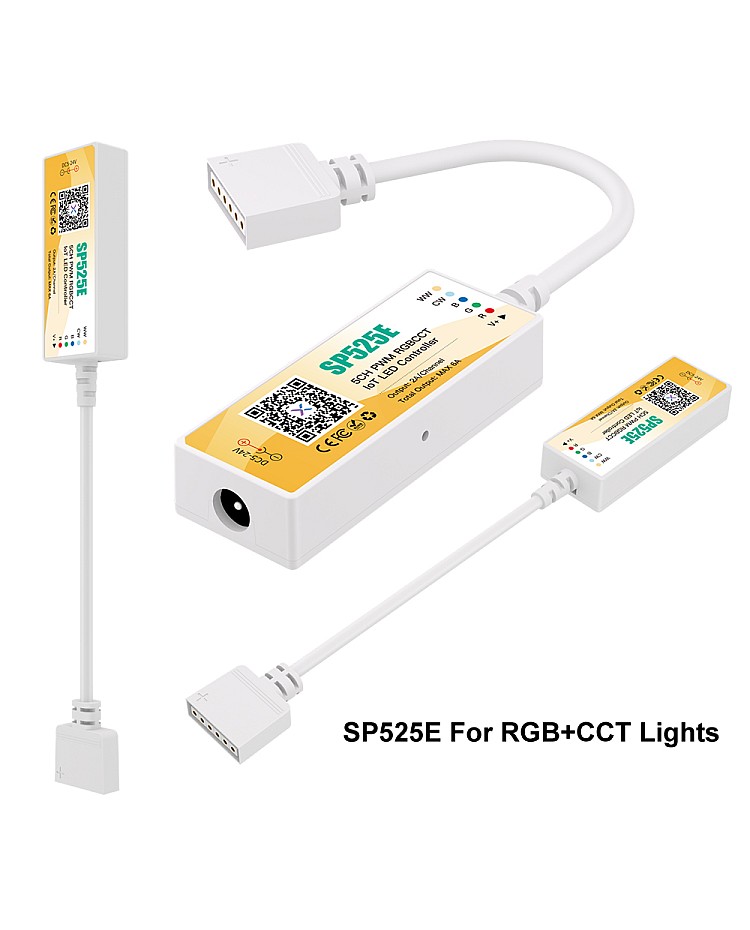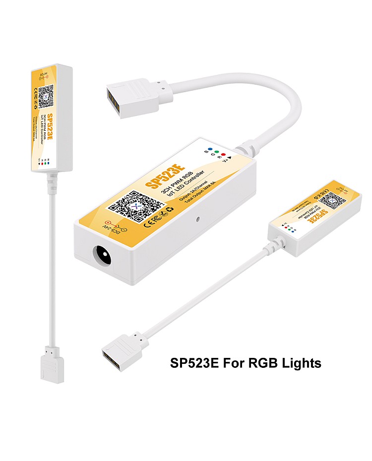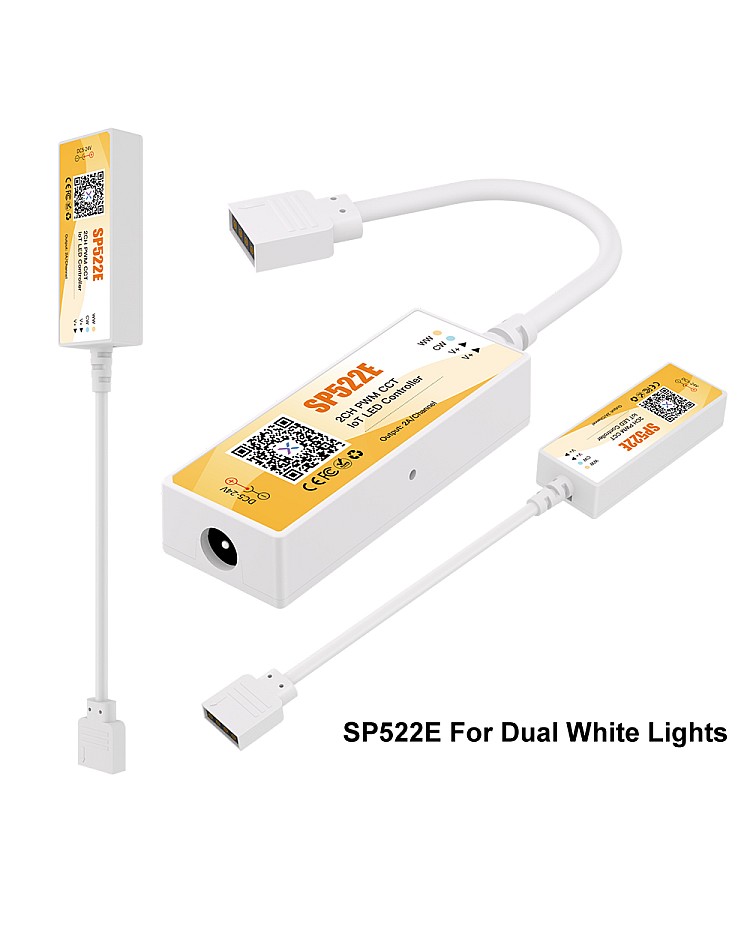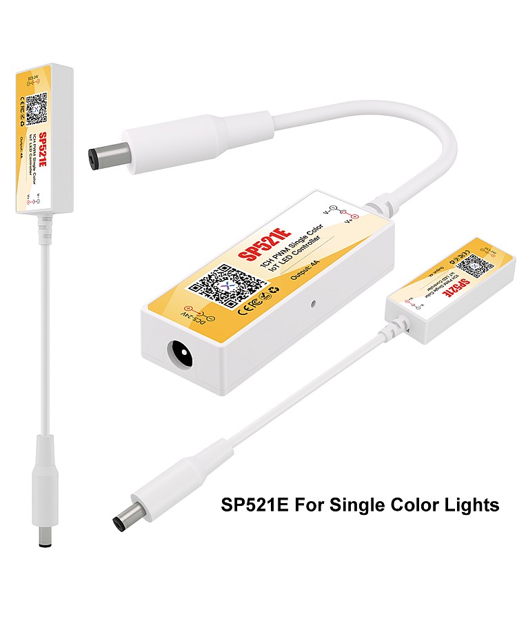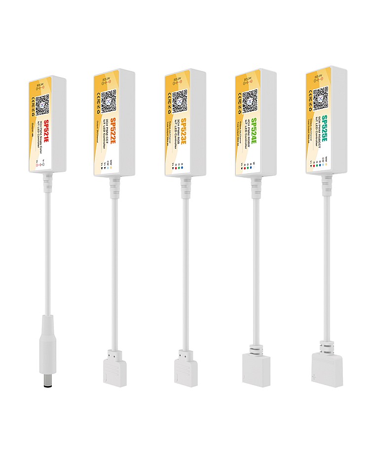 The SP52XE series mini PWM controllers are designed for all types of regular LED strips, and they are easy to connect to lights and power supply, and can be controlled by APP, voice, and remote. The PWM controllers have Bluetooth and WiFi dual-mode chips and support Bluetooth, WiFI, and remote cloud connections. There are five models available for all kinds of color lights: SP521E for single lights, SP522E for tunable white lights, SP523E for RGB lights, SP524E for RGBW lighting, and SP525E for RGBCCT lighting. Integrate high-frequency, precise PWM dimming technology, which allows you to adjust the brightness, color temperature, static colors, or dynamic effects. You can download the APP " BalanX' to your cellphone to control the LED lights remotely and achieve timer and group functions. The Sperll Bluetooth controllers have music modes, allowing input signals from a mobile phone mic, player streaming, or onboard mic. The input port is a standard female DC connector; connecting to the power adapter is easy. The output side has a specific connector to match the corresponding tape lights. The mini WiFi controllers allow you to install them conveniently and do not take much space, with multiple control methods for easy control. Because they are non-waterproof, they are only for indoor use.