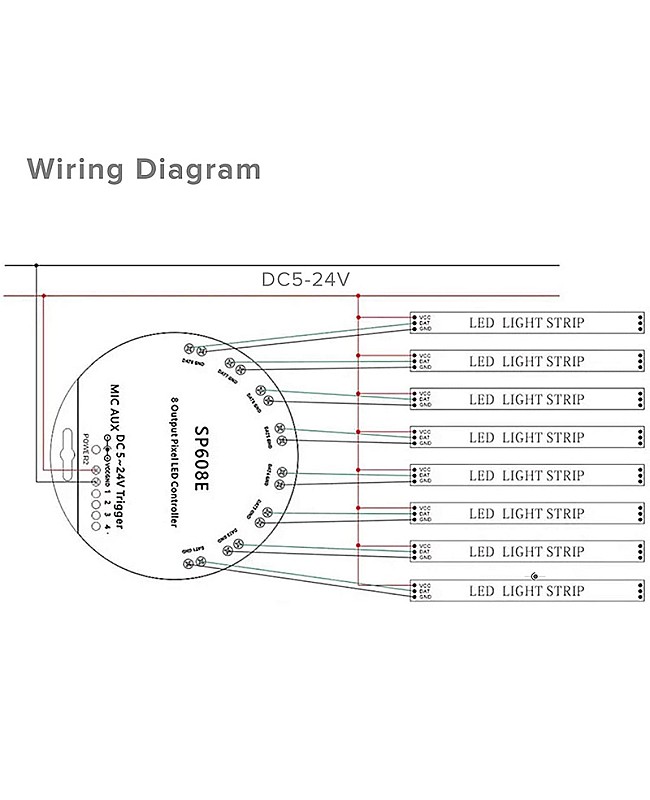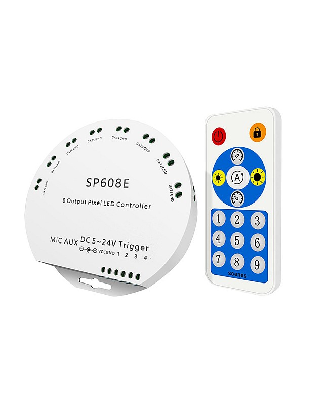 The SP608E addressable RGB LED controller has eight output channels and a maximum loading of up to 4800 pixels. The 14-key RF remote control includes and supports both smartphone APP and RF remote control, with eight output channels and supports eight different lighting effects, suitable for a variety of occasions to meet the various needs of customers, and can work with common single-wire magic LED strips like WS2812B, SK6812, etc. The Sperll controller has an audio cable that supports music and non-music effects, a built-in grouping control function, and any combination control of 8 channels. The memory function will reserve the settings that last worked.