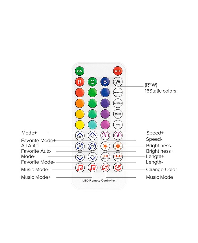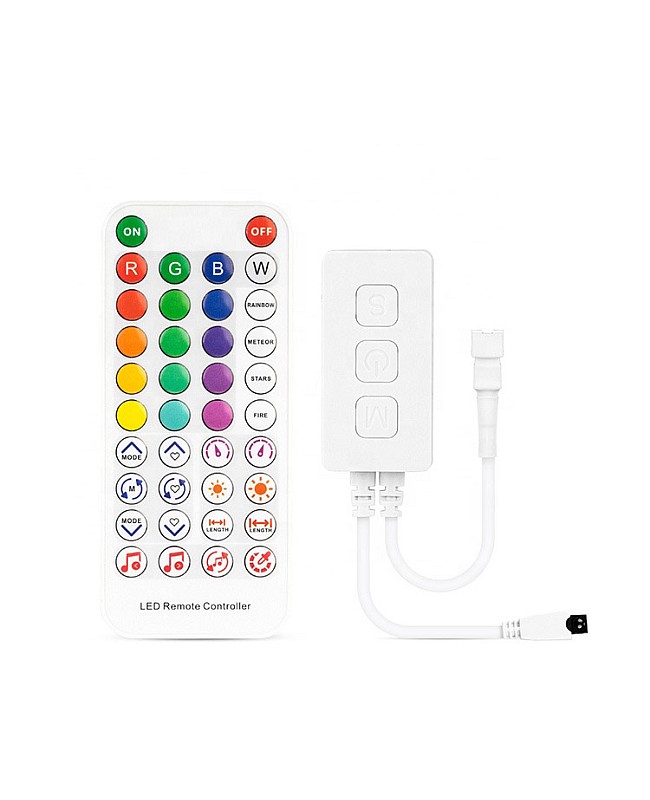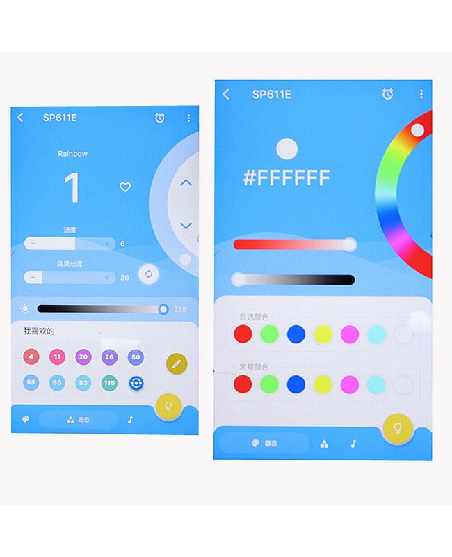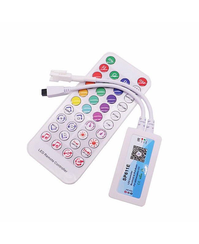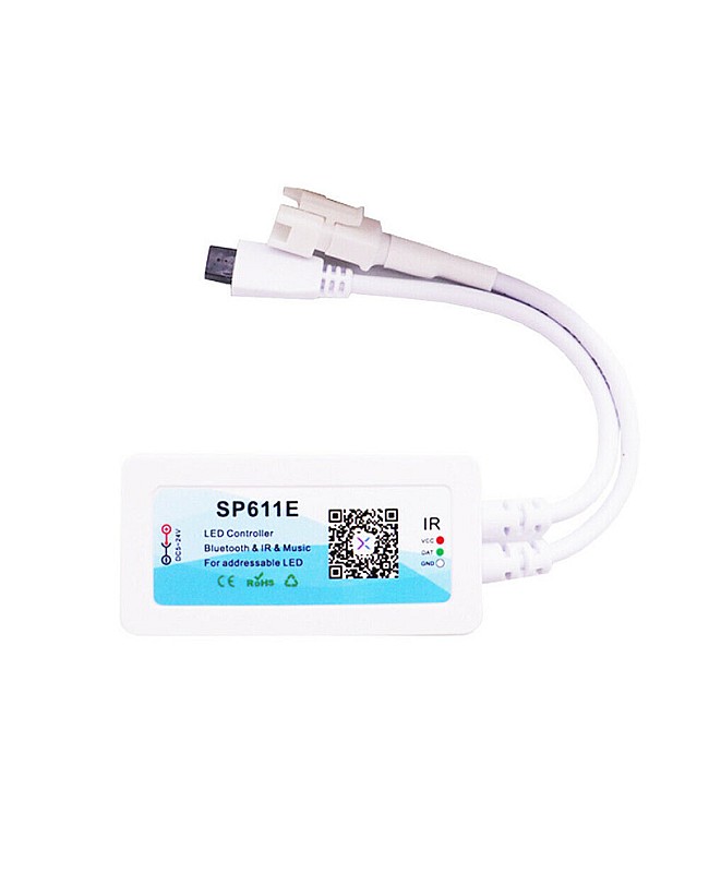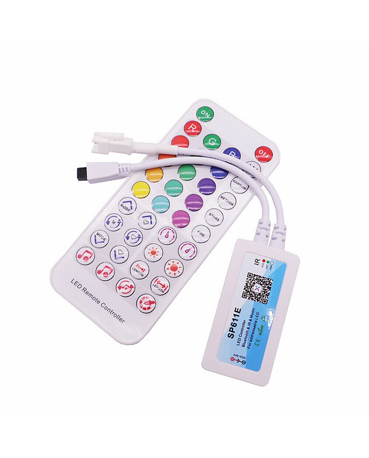 The SP611E Bluetooth music RGB LED controller is designed for the addressable pixel strip lights, offering dynamic color effects, music synchronization, and seamless wireless control via Bluetooth. Perfect for home entertainment, parties, and decorative lighting. They support the main types of intelligent single data wire ICs, like WS2811, WS2812B, WS2813, WS2815, LC8808B, GS8208, SK6812, SM16703, UCS103, and the maximum loading number of pixels up to 600PCS. The LED controller features three physical buttons, allowing you to turn the LED light on and off, switch between working modes, and adjust the speed. You can also control the SP611E LED controller using the app and a 38-key IR remote control. There are 142 built-in dynamic effects, including 18 music lighting effects. The effect length and music mode sensitivity are adjustable. When working in music mode, the LED controller collects the music signal from a phonemic player, streaming player, or onboard microphone. The lighting effect will change automatically to follow the beats.