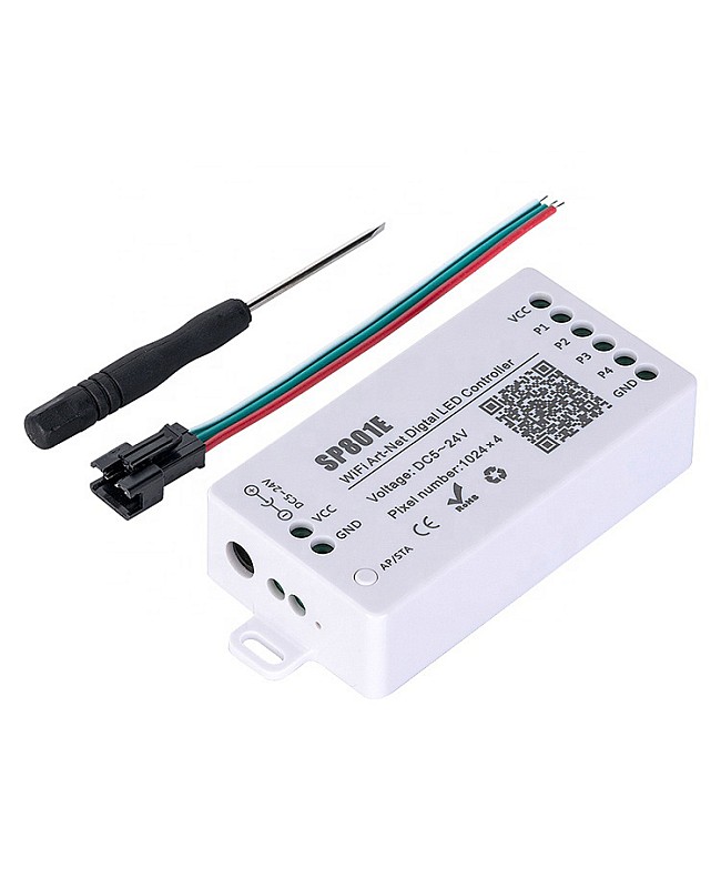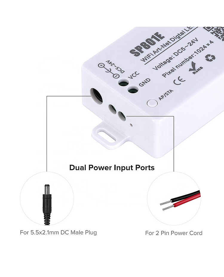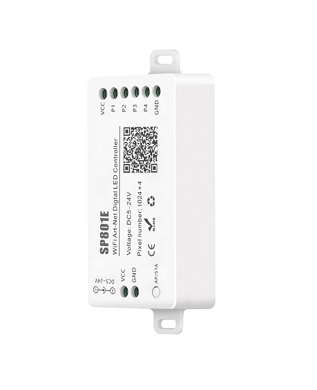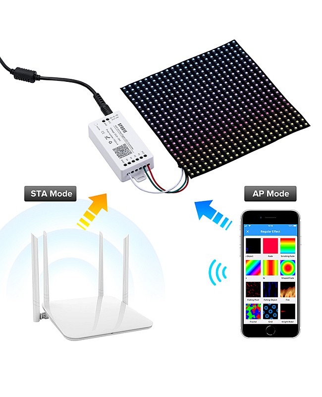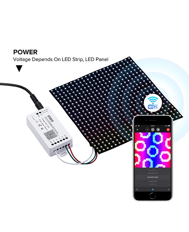 The SP801E smart LED controller by Sperll is a powerful and versatile device that enables you to control hundreds of ICs from your phone or tablet, and is compatible with addressable LED strip lights, digital light panels, and more. An APP can control the SP801E controller via WiFi and is compatible with multiple Art-Net software. Supports IOS and Android mobile operating systems. You can download the app "BalanX" from the App Store. The pixel LED controller supports AP mode and STA mode for various applications. Two layout setting methods are available: regular rectangle layout setting and importing DXF files, which support two-layer overlay, multiple built-in effect layer types, text layer, and music effect layer, among others. The effect layers support a variety of custom parameters, including direction, width, color, length, shape, and more. You can preview the layer in real-time on the app, and it supports recording the current scene for controller storage. This controller allows you to display complex lighting patterns without programming or a complicated setup.
