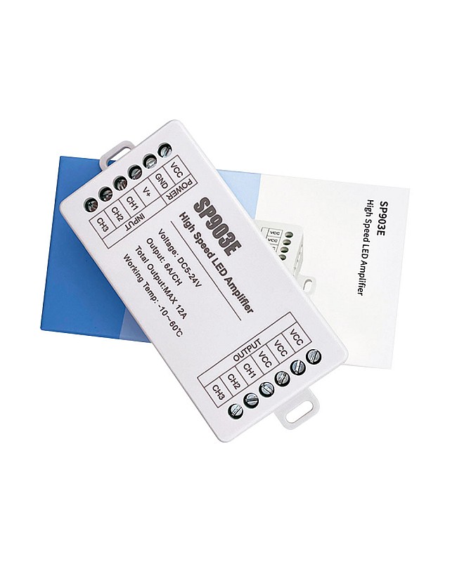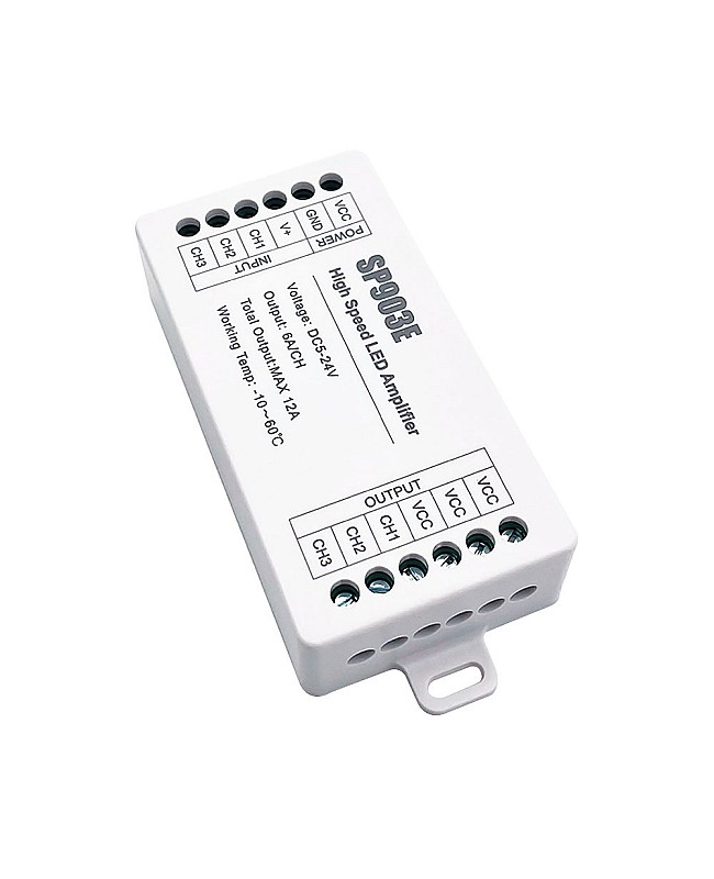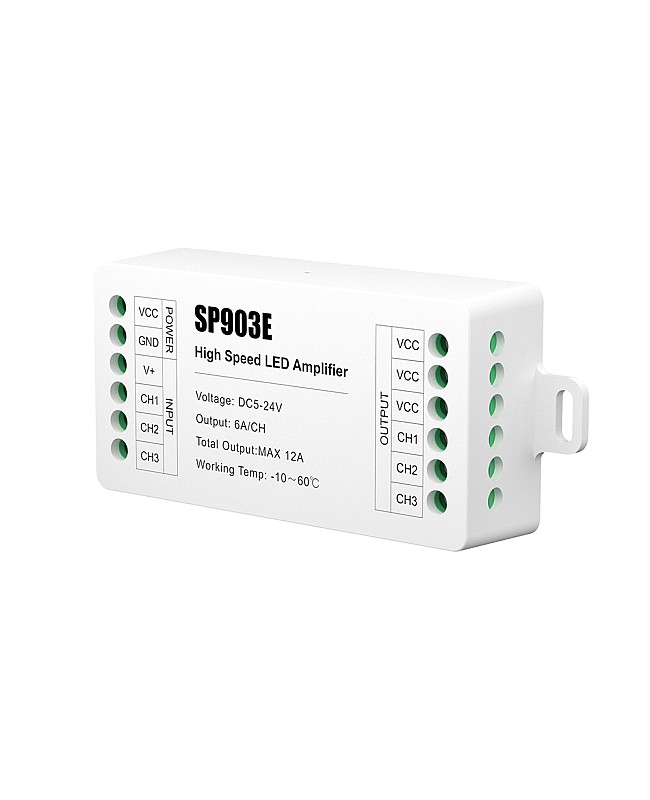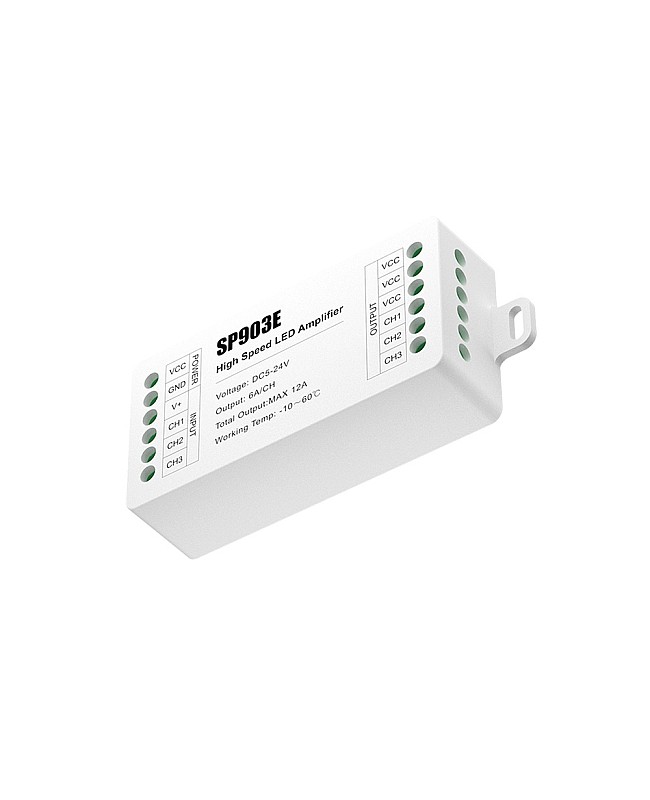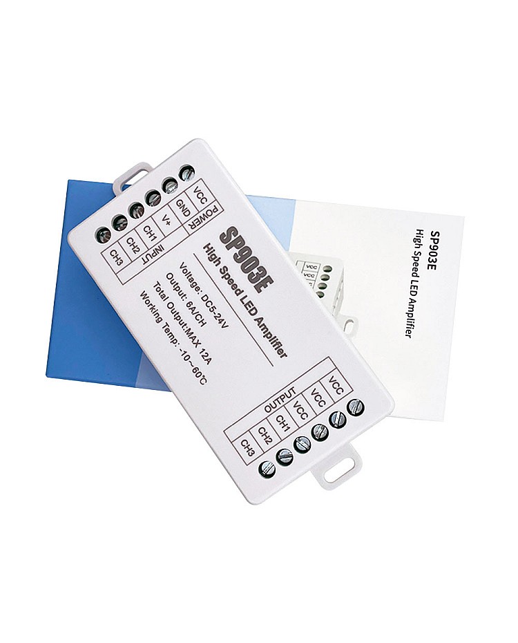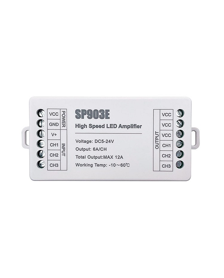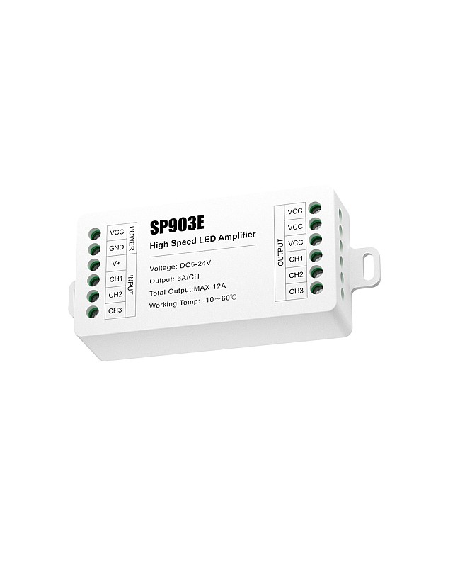 The SP903E 3-channel RGB LED light amplifiers have ultra-power MOS output for high load capacity. They will receive, process, and transmit a high-frequency PMW signal from the RGB LED controllers of up to 30 KHz to achieve accurate light control. These amplifiers can help create stunning visual displays in various applications by providing additional LED power and control. The input voltage ranges from DC5V to DC24V, and the input and output voltage can differ. With 3 output channels designed, each channel can be used independently or combined. You can use them for the regular RGB color-changing COB and SMD LED strip lights.