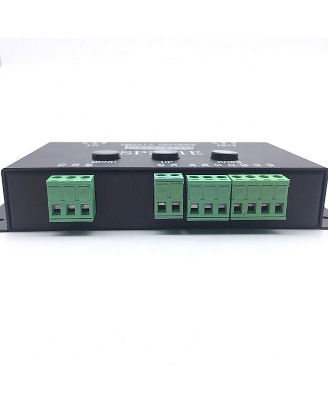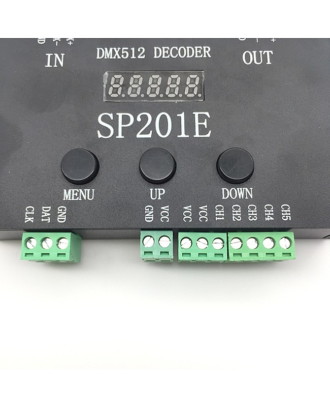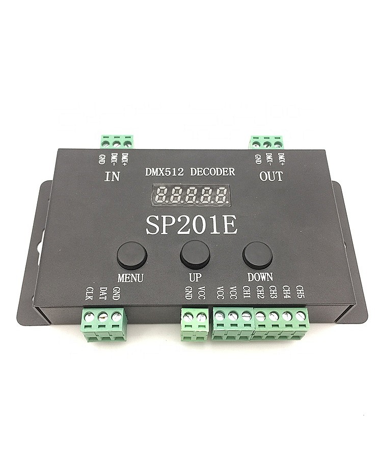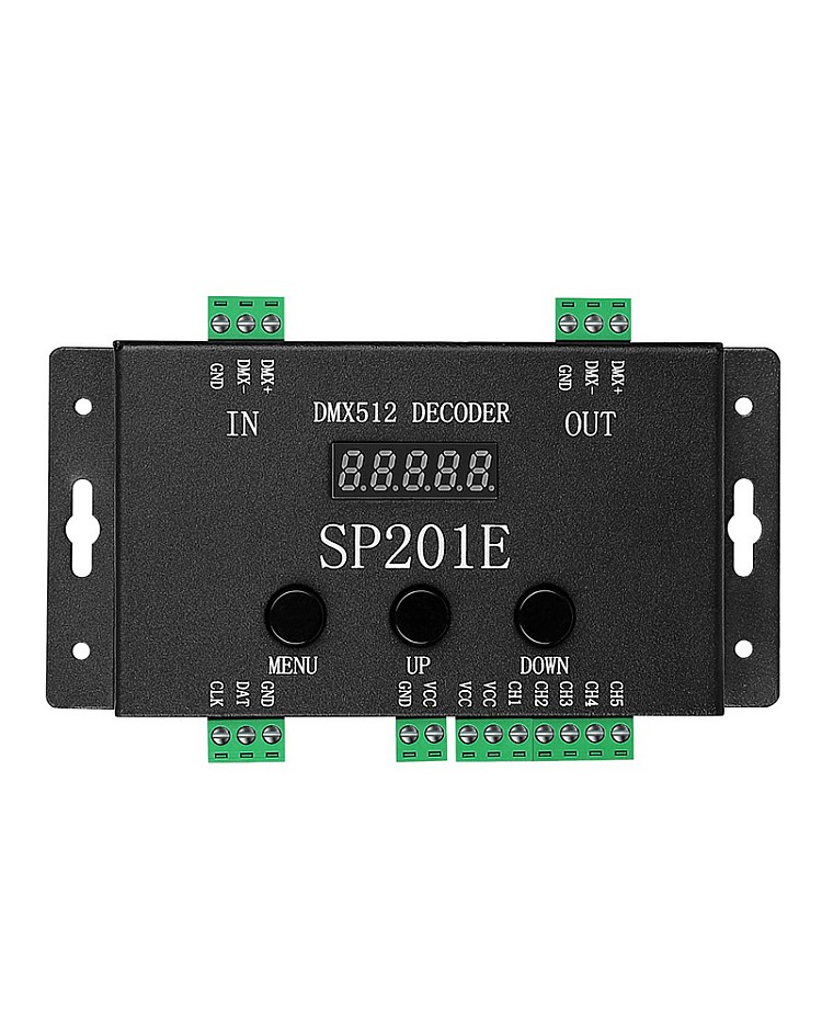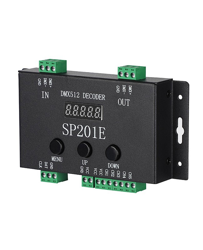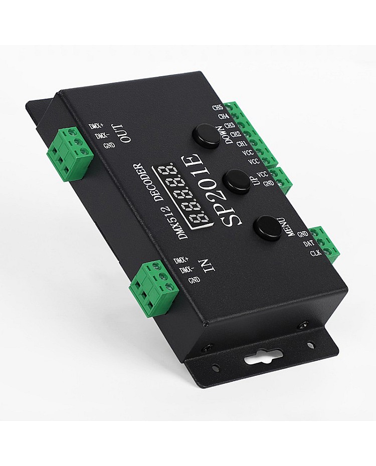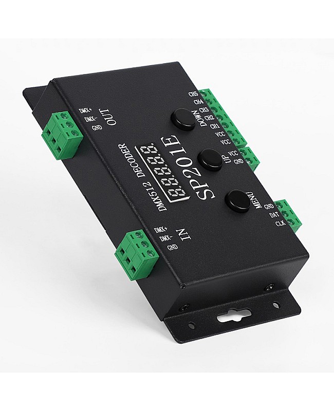 The Sperll SP201E is an excellent option for those who need a reliable and robust decoder that supports almost all one-wire and two-wire LED driver ICs, as well as DMX512. They can also be used as an SPI controller. It will convert the DMX512 signal into a standard addressable LED signal. When there is no DMX signal input, it can be used as an SPI LED controller and control up to 1024 Pixels. It features 99 built-in dynamic color modes, including flash, fading, smooth, chasing, stream, spreading, strobe, and more. It is also compatible with addressable Pixel LEDs and RGBWW 5-channel LED strips. The decoder can be cascaded with other DMX decoders and work synchronously. The DMX signal input can automatically identify DMX512 and function as a DMX decoder with a standard DMX-compliant interface. Decoding channels are adjustable, and the digital tube display shows them directly.