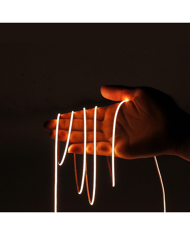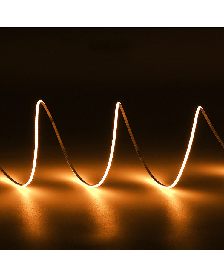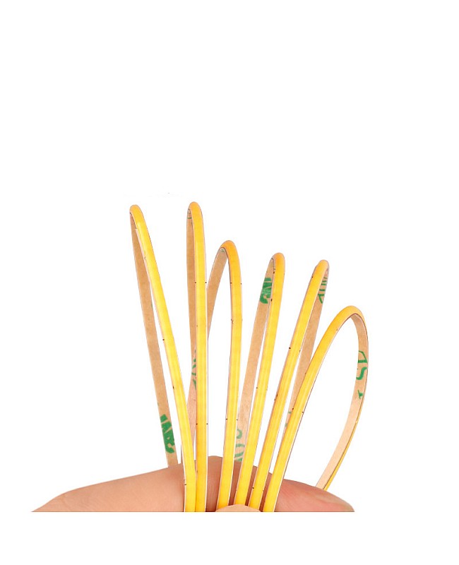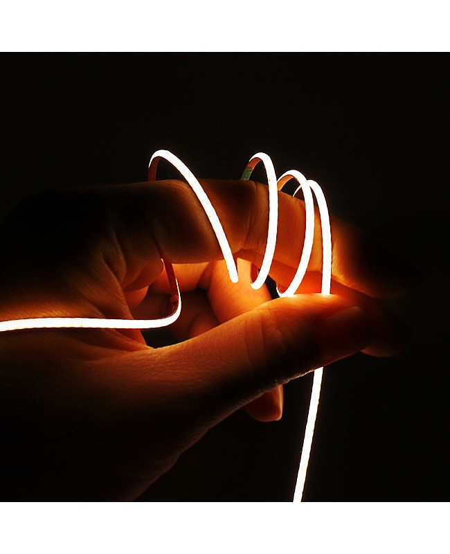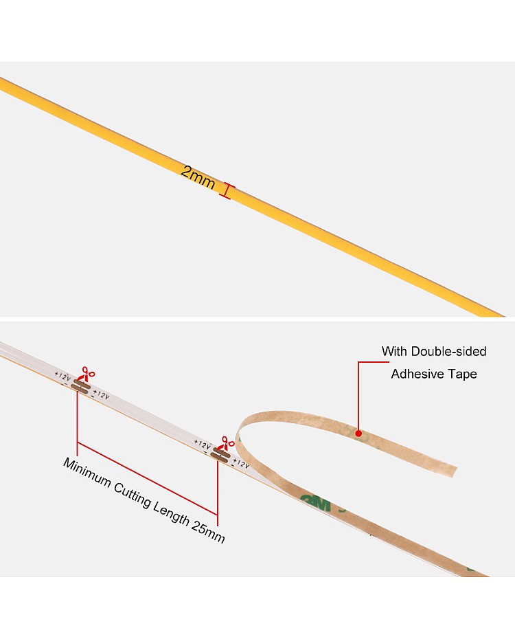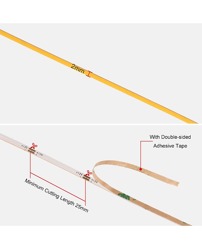 The width of the narrowest COB LED strips is only 2mm, allowing them to be installed in narrow or limited spaces that regular LED tapes cannot. Perfect for ultra-slim aluminum profiles or tight installations. They feature advanced COB (chip-on-board) technology, enabling 480PCS of LED chips to be attached to a one-meter PCB board, delivering continuous linear light with no visible LED dots, even in shallow or diffused profiles. They have a high color rendering index of 90Ra for true-to-life color accuracy. The standard length is 5 meters per roll, with a minimum cutting length of 25mm. You can cut to any size you need from the cutting point. The back features double-sided adhesive tape, making it easy to remove the protective paper and adhere it to the desired installation location. The LED COB strips can be used with LED dimmers to adjust brightness from 1% to 100%.