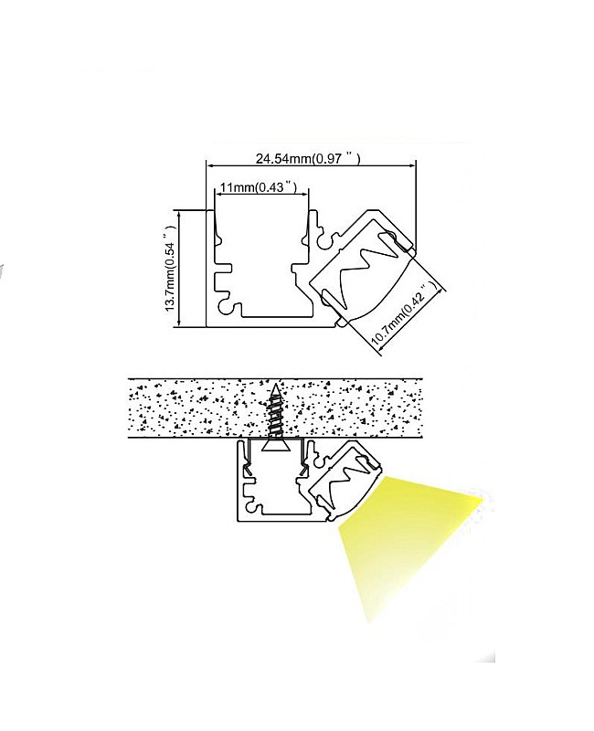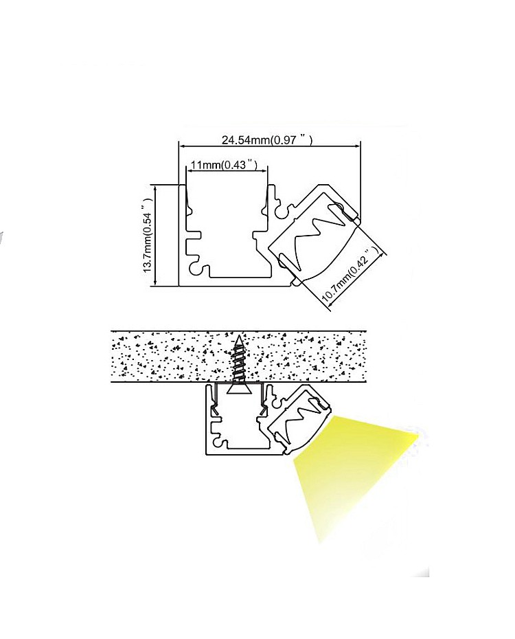 The small surface-mount LED channels, featuring a 45° inclined lighting design, offer a sleek and modern solution for illuminating your cabinets or shelves. The inclined design enhances the aesthetic appeal and optimizes the direction of light. There are three types of lenses available to create the perfect lighting effect for any space. You can use them as task lighting under cabinets or shelves, etc. The cabinet LED channels are made of 6063-T5 extruded aluminum and feature an anodized surface treatment for enhanced durability and a longer lifespan. It can protect the flexible LED tapes from physical damage, dust, and moisture, and also serve as a heat sink for improved heat dissipation. The inner width is 10.7 mm, and the maximum width of the strip light is 10 mm. Three types of lenses are available: asymmetric, PMMA 35°, and PMMA 55° lenses. You can use them for focused task lighting, balanced ambient illumination, or wide coverage. The metal mounting clips are included, allowing them to be easily mounted on the surface of your projects.