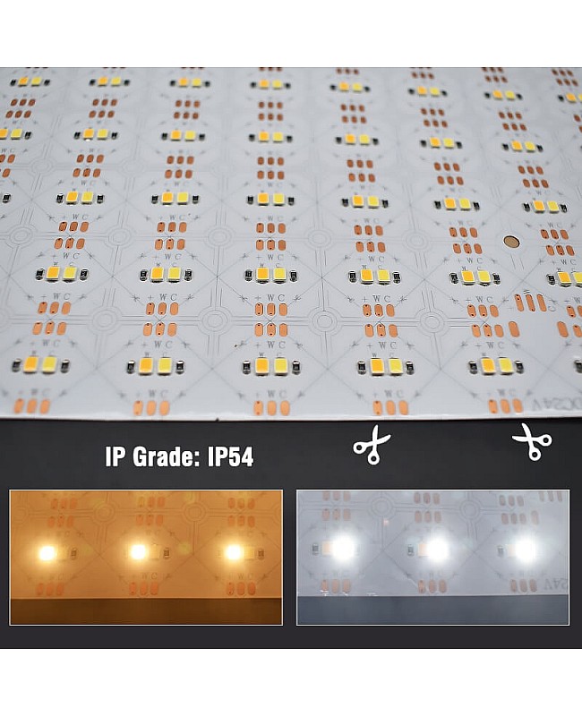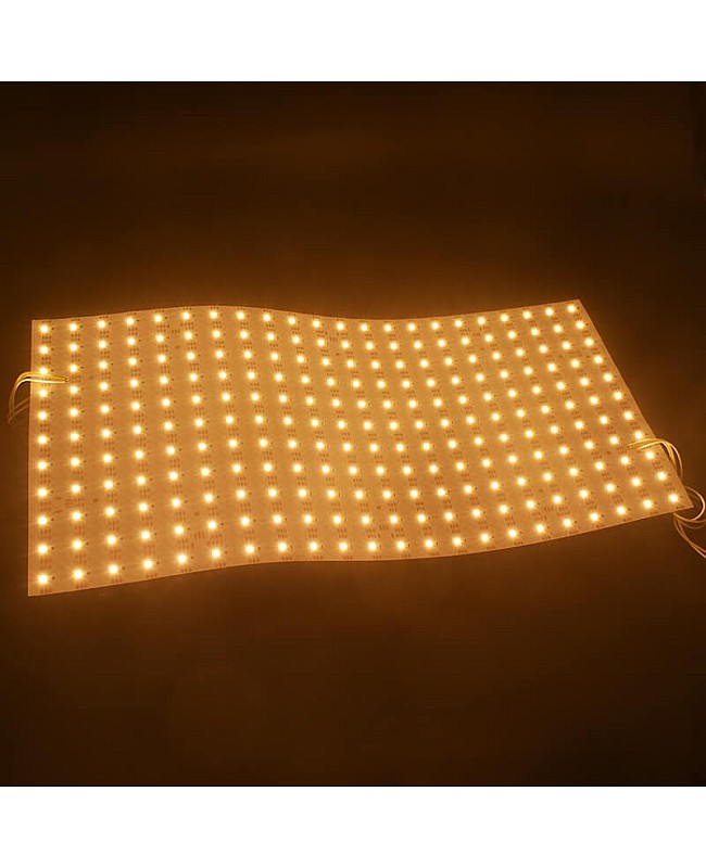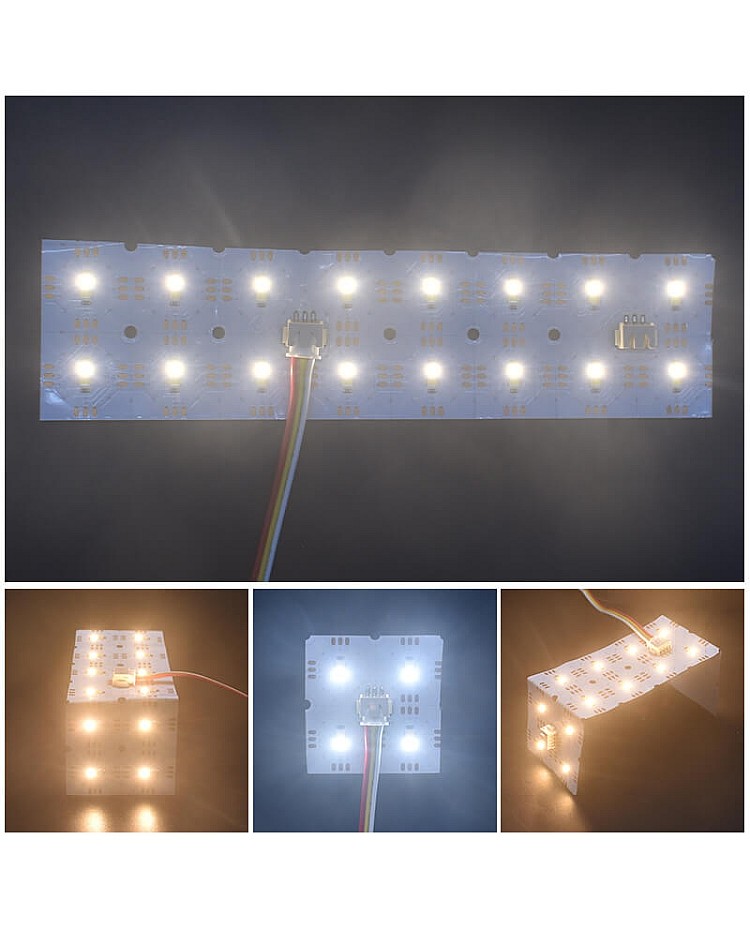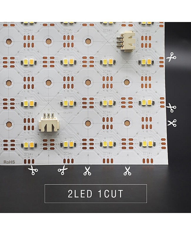 The tunable white LED light sheets have an ultra-thin design. They are lightweight, flexible, and bendable, allowing them to conform to flat and contoured surfaces. This provides uniform illumination, enabling the adjustment of color temperature and brightness for various scenes. You can use them to highlight architectural features or as backlighting for shopping windows, advertisement displays, countertops, and more. Two sizes of sheet paper are available: 250 mm x 250 mm and 490 mm x 250 mm. The SMD LEDs are arranged on dual-layer PCB boards, and the back features double-sided adhesive tape for simplified installation. They are trim lines on the PCB board, allowing you to cut to any size for your projects. The LED panels have power connectors, allowing you to connect multiple panels for larger projects. The flexible boards can work with the CCT LED controller to adjust the color temperature from 2700K warm white to 6500K cool white and adjust the brightness to fulfill various needs.
