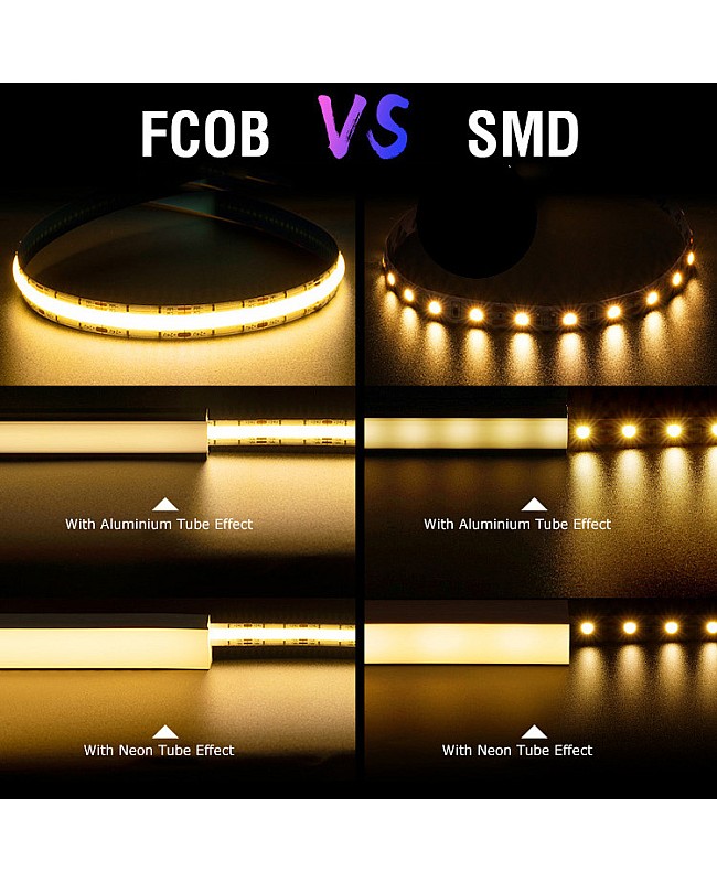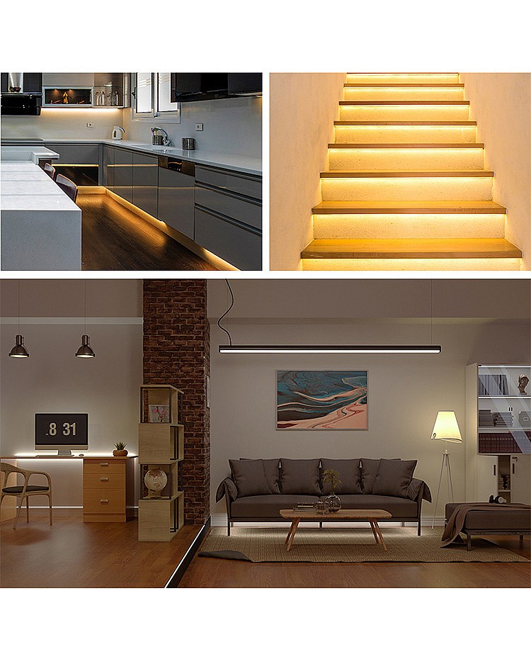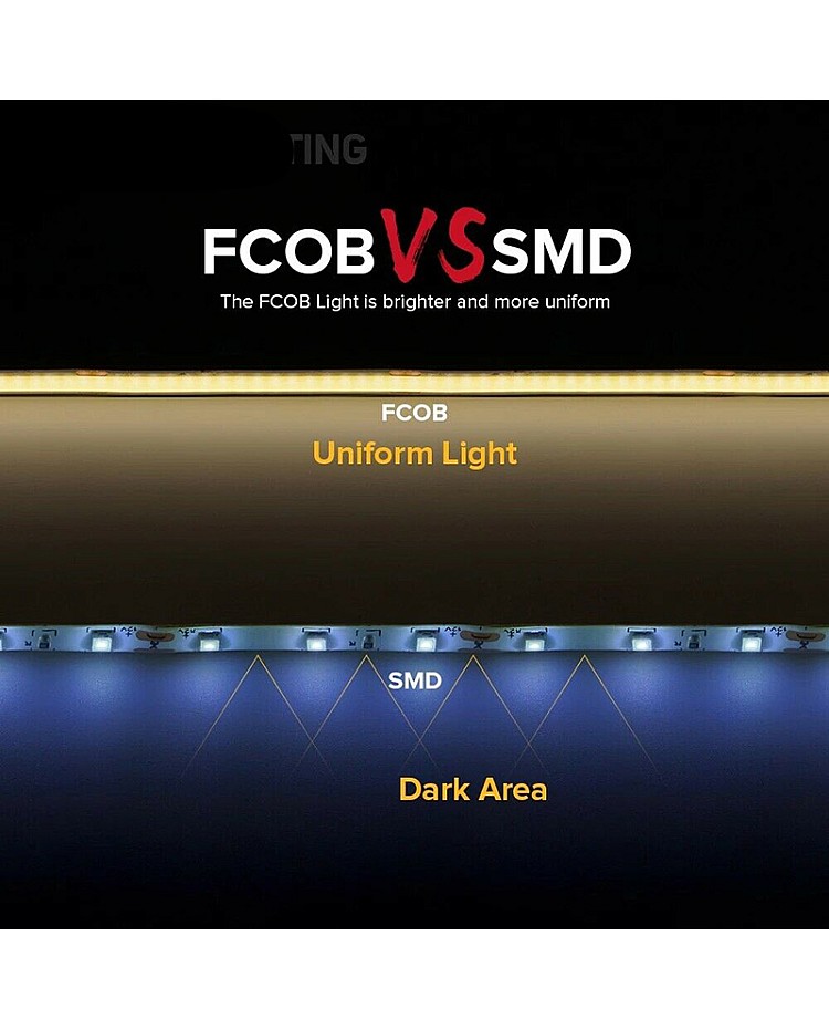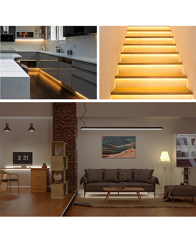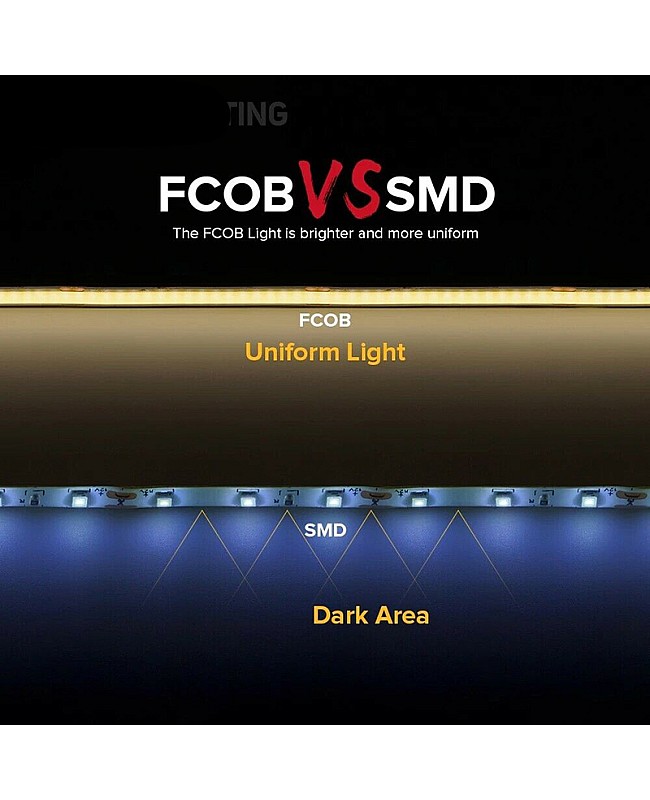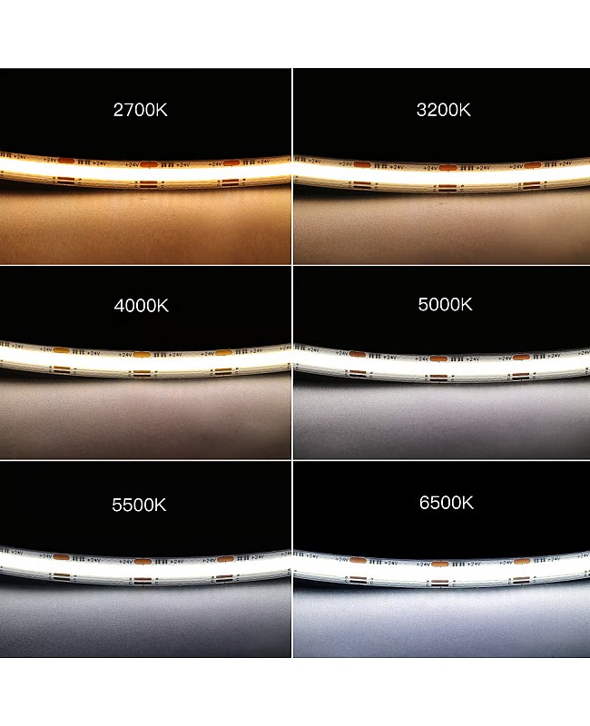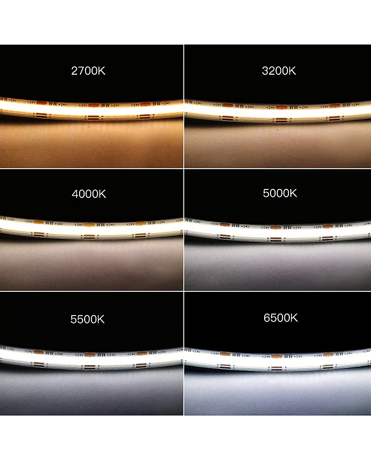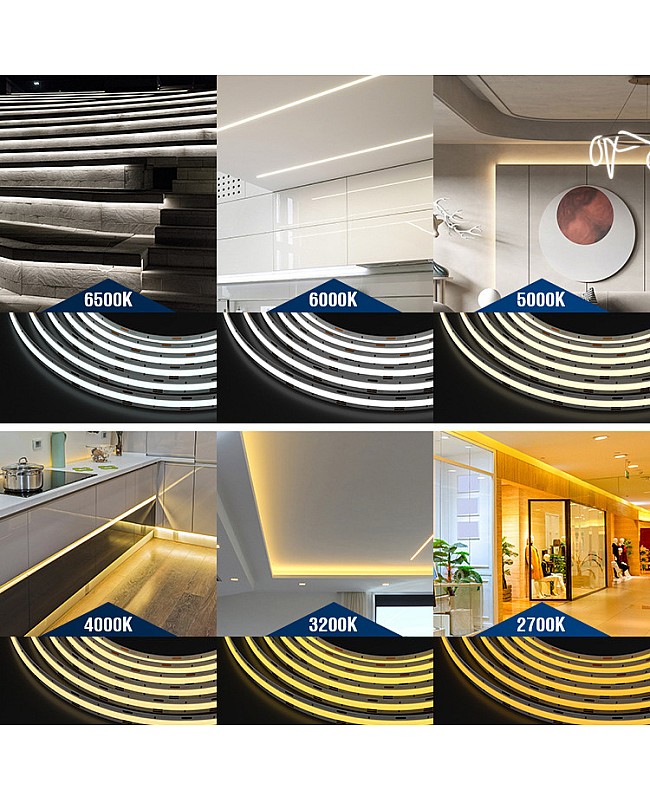 The tunable white COB LED strips work on 24VDC and allow the color temperature to be adjusted from 3000K(warm white) to 6500K(cool white) for different needs, creating various lighting effects and easily controlled with a compatible light dimmer. Working on DC24V for a longer max run, it is easy to connect to the power supply to light up or connect to a CCT controller to adjust the brightness from 0% to 100% and color temperature. The CCT LED strips use the newest COB technology: high LED chip density, 640PCS 1010 LED chips per meter, brighter, high CRI, better heat dissipation, no hot spots, uniform light emission, and longer lifespan. Various product lengths are available, and you can choose from 0.5M to 5 m per roll. The mini cuttable size is 25mm, and you can cut to any length that fits your needs. The back has a self-adhesive backing, making it easy to install. The tunable white COB LED stripes are non-waterproof and only recommended for interior lighting. You can use them to create a warm, inviting atmosphere in residential or business settings, and their adjustable white light makes them ideal for highlighting artwork or other objects.