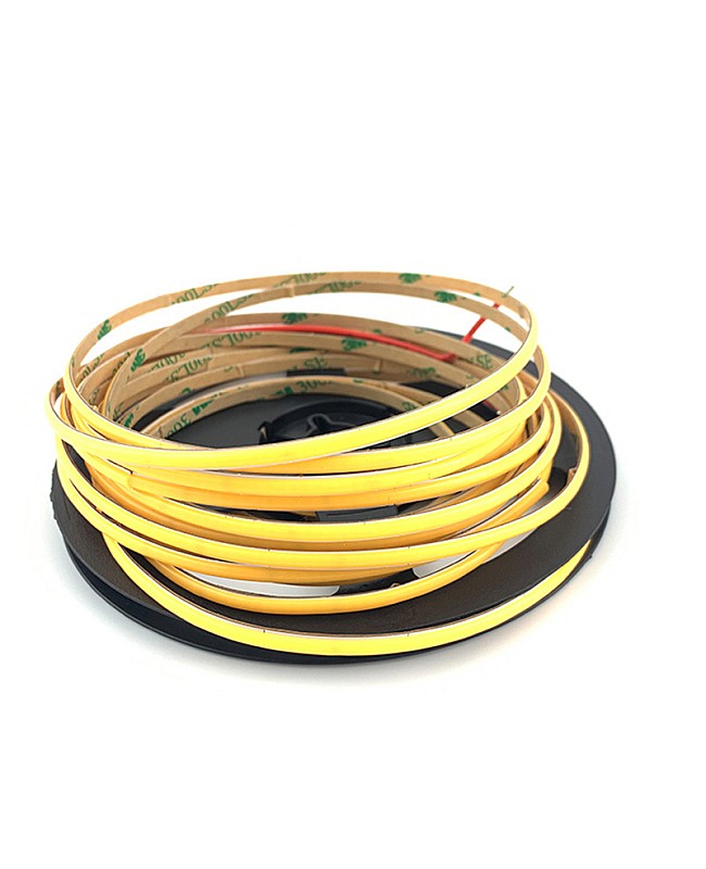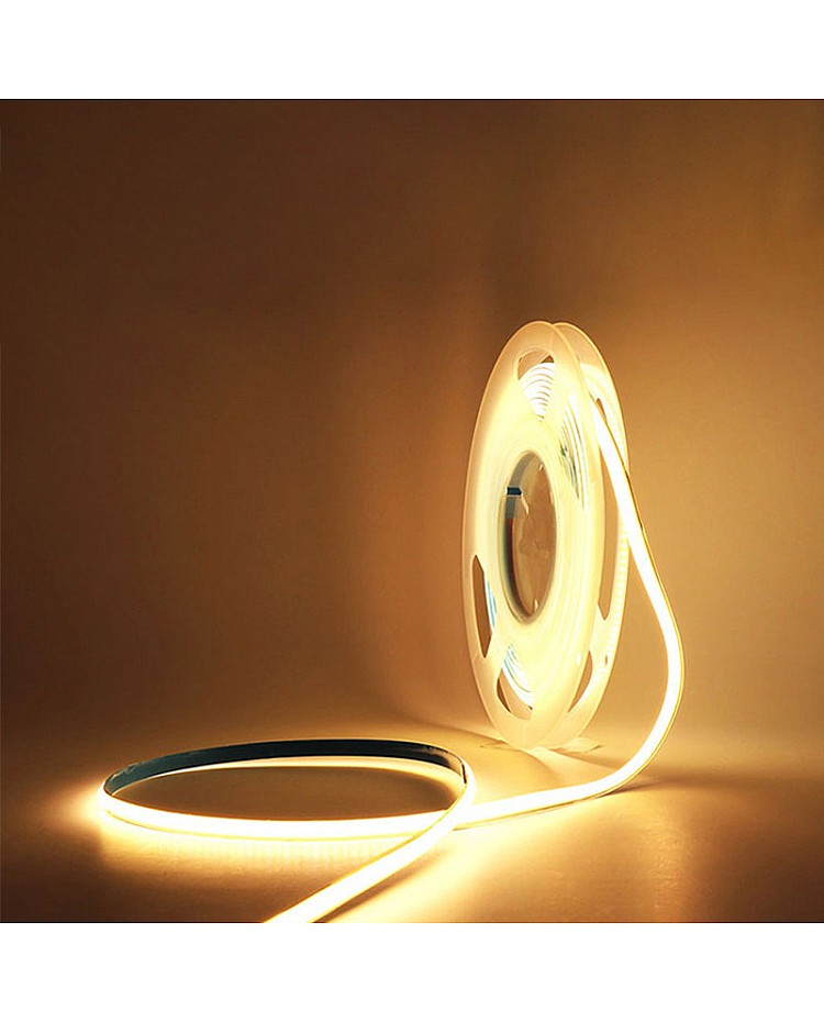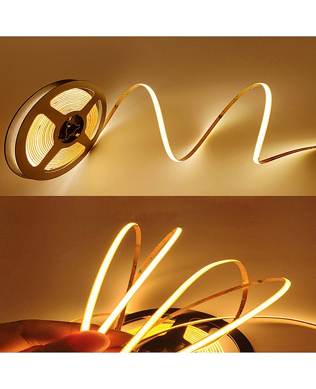 The ultra-slim strip LED COB, a width of only 3mm/4.5mm, is suitable for narrow applications like under-cabinets, jewelry cases, etc. With the chip-on-board design. There are 2,640 high-quality LED chips, flexible and bendable, that are mounted on the 5-meter dual-layer gold-plated FPC board. The high density of LEDs creates a seamless and smooth line of light, NO visible light dots and hotspots, brighter than the SMD LED strips, and uniform light emission, with a 90+ CRI for quality color rendering. The COB LED strips are cuttable; the minimum cuttable length is 22.73mm, and you can cut to any length for your project following the cutting marks. The back has double-sided adhesive tape, and it is easy to remove the protective paper from the tape and stick it to where you want to install it. The IP rate is IP20 non-waterproof and only recommended for indoor applications. Various emitting colors of products are available, and you can choose warm white, natural white, and cool white for multiple scenes. It can work with light dimmers to adjust the brightness from 0 to 100%. You can use them on kitchen counters, display cases, under-cabinets, furniture, TV backlighting, etc.