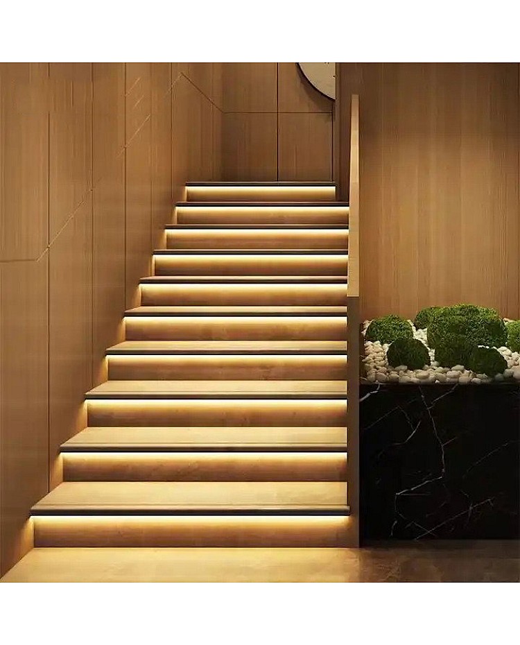 The ALP024-R1 is a heavy-duty black LED profile and is designed for safe, functional, and stylish step lighting. They can be installed along stair edges and feature an up-down lighting design. The downward lighting will illuminate the stair tread for safety and visibility, and the inclined upward lighting provides ambient or accent lighting along the stair edge or wall for aesthetics. They have an anti-skid surface and come with a PVC anti-skid cover to enhance aesthetics and prevent slips or falls. Ideal for both residential and commercial applications, such as staircases, hallways, hotel lobbies, theaters, and public spaces. The stairway light channels are constructed from durable extruded aluminum and have anodized finish for anti-oxidation resistance and a longer lifespan. Six types of diffused covers are available for various light transmittance. They are made of high-quality material, anti-yellowing, for perfect light distribution. The stock lengths of the stair tread light channels are 2 m, 2.5 m, 3 m, and custom lengths are supported. The inner width is 10.5 mm, allowing a maximum strip light width of 10mm. You can add our 10mm COB strip light as the light source to create uniform lighting without hotspots. The aluminum channels can work as heat sinks for better heat dissipation, which will extend the lifespan of LED strips. The end caps are included to provide a professional finish.