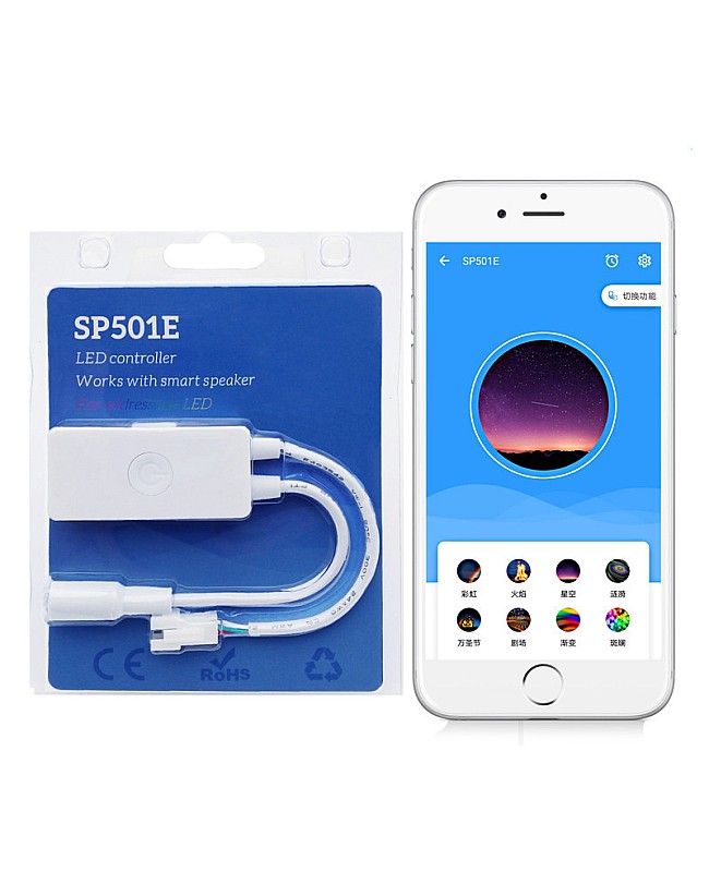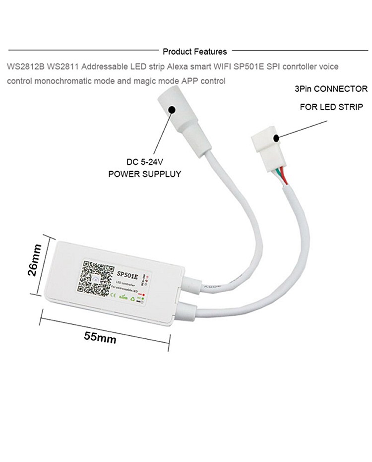 The SP501E WiFi Pixel LED controller can work with Amazon Alexa, Google Home, and other smart speakers, and you can use voice commands to control the LED lights. The SP501E controller works on DC5V-24V, has a maximum loading number of pixels up to 1024PCS, and supports the main types of ICs, like WS2811, WS2812B, WS2813, WS2815, etc. You can add the smart LED controller to your WiFi network and control it via the app or voice commands. It supports IOS 10.1 above and Android 4.4 above mobile operating systems, with 180 built-in dynamic effects with adjustable brightness and speed. The WiFi LED controller with JST connector can easily connect to the programmable digital LED light strips and set your desired lighting effect.