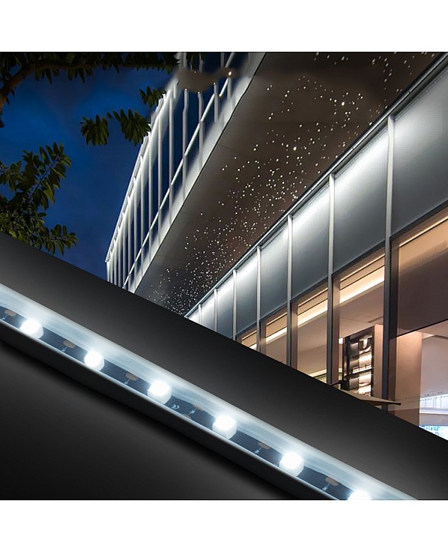The waterproof wall wash lighting strips are designed for indoor and outdoor use. These high-performance LED strips feature a precision lens to deliver smooth, uniform light distribution, eliminating hotspots for a flawless wall-washing effect. The built-in 30° optical lens ensures wide, even illumination, perfect for accent, cove, and facade lighting to enhance architectural features. The one-meter PCB board contains 36 high-quality LEDs in a silicone tube for waterproofing and dustproofing. Ideal for outdoor landscapes, pools, and wet environments. The tube is also flexible and can be shaped into a round, etc. Three white products are available; you can choose warm white, neutral white, or cool white for different scenes. The back has strong adhesive tape and optional aluminum channels for seamless mounting on walls, ceilings, etc. The wall wash strip lights work at 24VDC, safer than 120V/220V systems, while delivering high brightness with minimal power consumption.