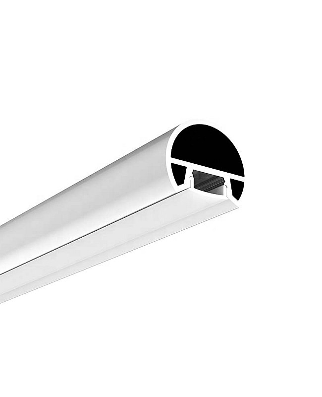 The round LED profile helps illuminate closets and is designed to be mounted on the top of the wardrobe as a rail, providing a soft and flattering light that illuminates your clothes without casting harsh shadows. The standard lengths are 1 m and 2 m, and can be cut to any size you require. They are made of 6063-T5 aluminum alloy and feature anodized surface treatment, which provides anti-oxidation properties and a longer lifespan. The inner width is 12.3 mm, allowing for a maximum width of 12 mm for the LED tapes. You can install our 10mm dotless COB LED strips for uniform illumination without hot spots. Only one type of diffuser is available: the PC diffused cover, made of high-quality material with stable properties, anti-yellowing features, and perfect light distribution, resulting in a soft light output. This round light profile is ideal for creating an illuminated wardrobe that looks great and provides ample light for clothes hangers. End caps or hanging clips are included for two installation methods are available: surface-mounted and suspended.