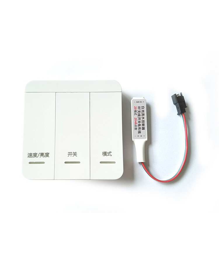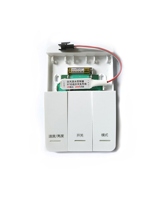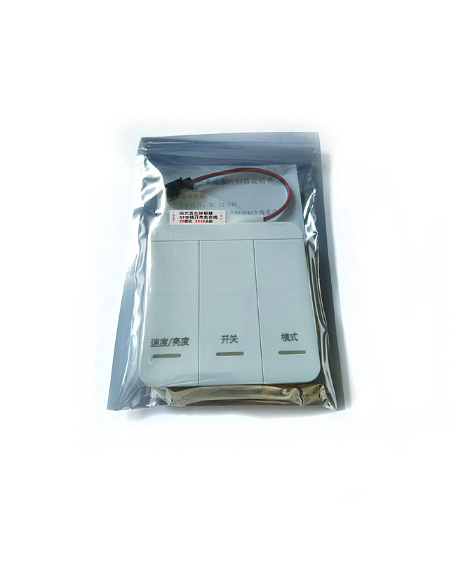 The water flow LED strip controller with wireless remote control can work with white digital LED strips to achieve the running water or water flow effect. The input voltage range is from DC12V to DC24V, and it supports ICs up to 2048 pieces. The default setting is 80 pieces. There are 28 lighting effects, and you can use them to achieve the running water or water flow effect.