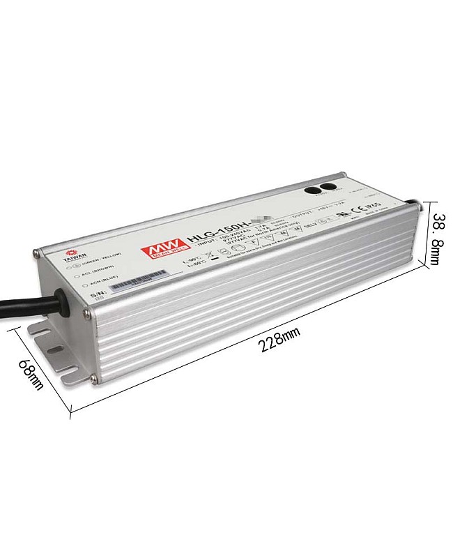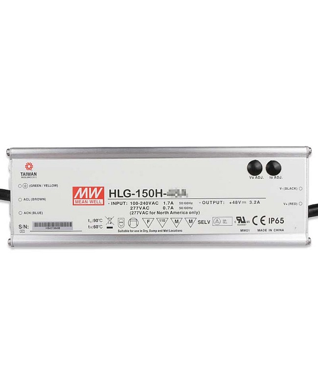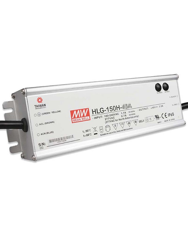 The Meanwell HLG-150H series waterproof adjustable power supplies, 4 types of products offer various output voltages from DC12V to DC54V. The A and AB Types have output voltage and current adjustable through the built-in potentiometer, and the B, AB, and D types have the dimming function for LED lighting systems. The Mean Well adjustable power supplies were enclosed in the metal housing and with class I design, featuring the dual mode constant voltage and constant current output design, the input voltage range from AC90V to AC305V, can connect to the public power system directly and without extra adapters. the high-efficiency rate up to 94%, with the fanless design, the operation temperature from -40℃ to 90℃ and the case temperature under free air convection. The metal housing design and IP67/IP65 ingress protection level allow this series to fit indoor and outdoor applications. The lifespan is over 62,000 hours and gets a 7-year warranty.