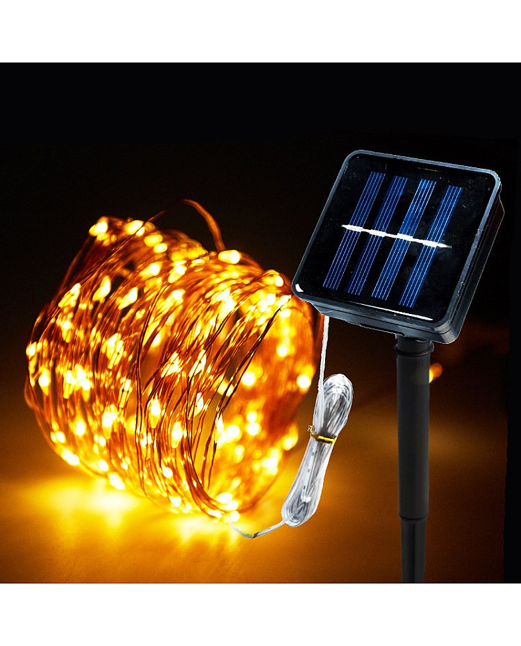 The solar string lights for outdoor use use the high-quality San An 0603 LEDs as the light source. The LEDs are sealed in high-quality glue, which is waterproof and dustproof. The waterproof level is IP65; you can use them for indoor and outdoor applications. Various LED products and lengths are available; you can choose the 50PCS, 100PCS, and 200PCS LEDs, 5 meters, 10 meters, and 20 meters products for various needs. There are 9 emitting colors products available, you can choose the single color or multicolor String Lights. The solar panel, which includes a rechargeable battery, is easy to install and use. The solar panel will charge the battery in the daylight, and the battery will power the String Lights at night. On the back of the solar panel with 2 physical buttons, ON/OFF and mode buttons, you can use the ON/OFF button to turn on or off the solar string lighting, and press the mode button to adjust the working modes. There are 2 modes and 8 modes of products available. The inserted pole included, you can install them in the yard, lawn, garden, park, patio, etc, for Christmas, Weddings, and other holiday decorations.