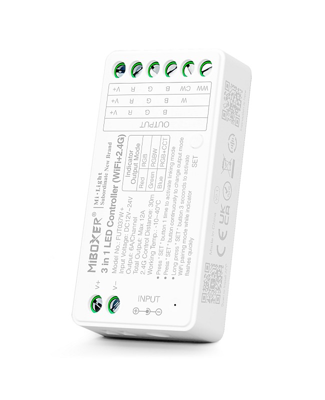 The MiBoxer FUT037W+ wireless LED strip lights controller has a 3-in-1 function design for RGB, RGBW, and RGB+CCT LED lights. The controller integrates WiFi and 2.4G communication modules and can be controlled by 2.4G remotes, smartphone APP, and third-party voice commands. You can turn ON/OFF, set the color, and adjust the color temperature and brightness for various scenes freely. There are 16 million colors to choose from, and the color temperature is adjustable from 2700K to 6500K, and the stepless dimming brightness is from 1% to 100%. You can download the APP to your phone to achieve more functions like timing, music rhythm, tap-to-run, scene customization, device sharing, etc. It can work with Amazon Alexa and Google Assistant, and you can use voice commands to control ON/OFF, adjust brightness, etc., through voice commands. There is a physical button on the controller, and you can press it continuously to change the output mode from RGB, RGBW, and RGB+CCT. The WiFi light controller will receive the signals from a remote and transmit them to another controller within 30 meters; all will synchronize. The MiBoxer controller has two power interfaces: a wiring port and DC connectors, which are easy to connect to an LED power supply.