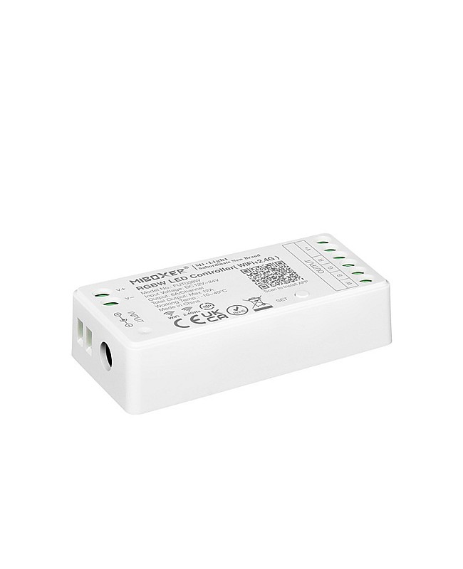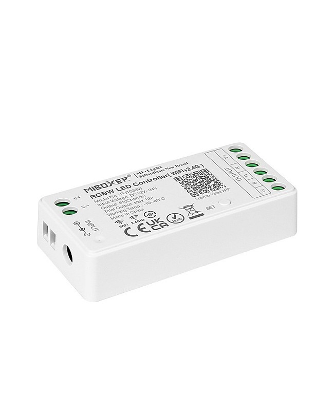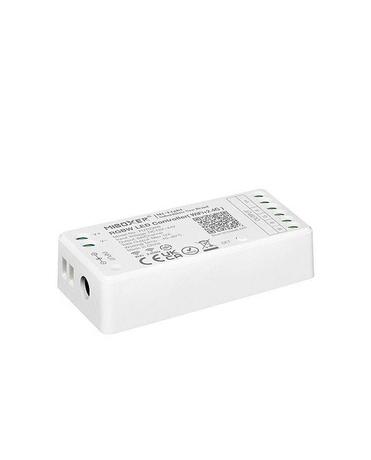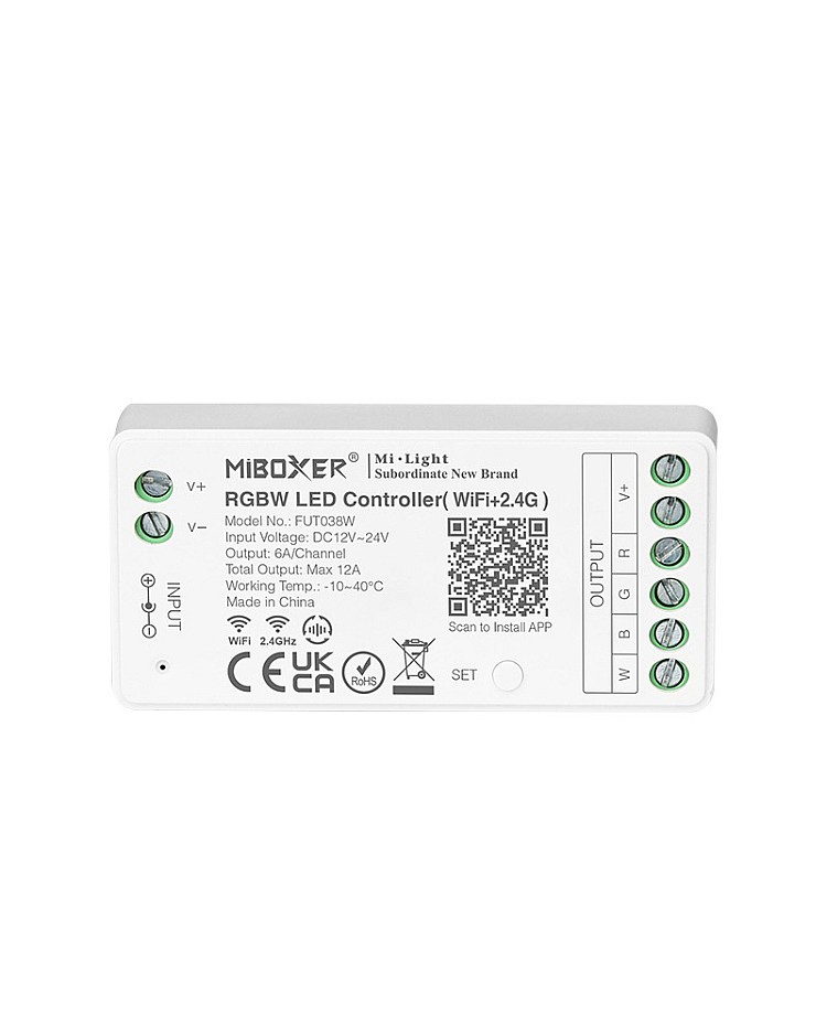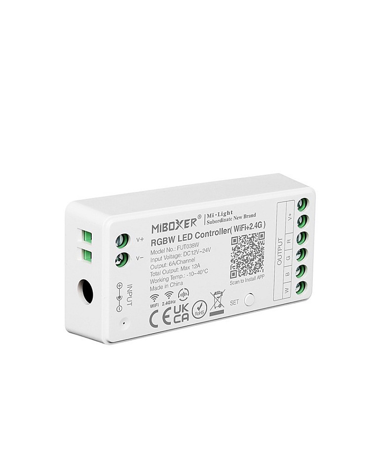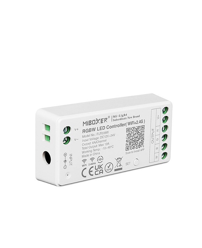 The MiBoxer FUT038W 24V RGBW controller has a WiFi and Bluetooth-compatible dual-module design, and can be used for the RGBW LED light and strip lights. You can set the static color and adjust the brightness. There are 16 million colors available, which can be controlled by smartphone apps, third-party voice commands, and 2.4G RF remotes. The 24V LED controller supports music rhythm, and the LED lights will dance with the rhythm of the music, and you will enjoy the visual feast. The FUT038W with a timing function allows you to set the opening and closing times according to your lifestyle, and you can set the fade-out/fade-in of lighting before falling asleep or waking up. One RGBW controller will receive the signals from the remote control and transmit the signal to other controllers within 30 meters, and different ones will work synchronously.