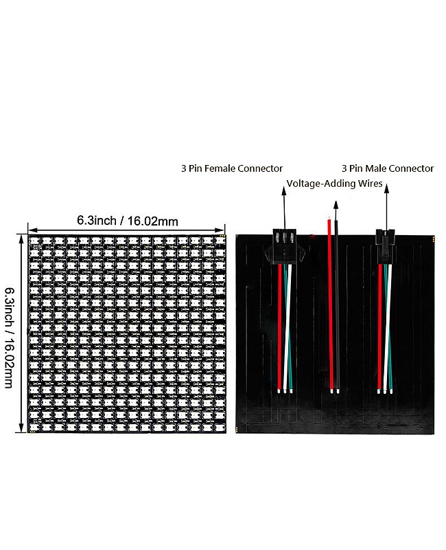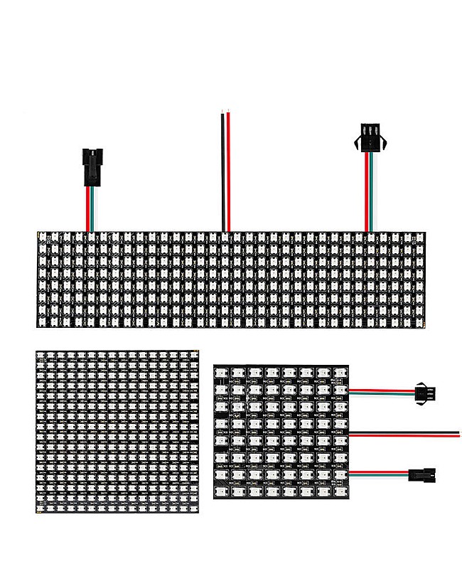 The programmable LED matrix panel screen has 3 sizes available. You can choose the various sizes with different SMD LEDs. The LEDs are mounted on the FPCB, and every piece of LED is built with a WS2812B IC. The LEDs can be controlled individually, working in DC5V, with Arduino controllers or other programmable SD controllers, arbitrarily cut off, flexible, easy to install, and bent. You can use them to achieve many amazing lighting effects like curtain-up, flowing water, raindrops, and jump flash. You can edit animation effects using CorelDRAW/Flash/LEDEdit software. The IP rating is IP20 non-waterproof and only recommended for indoor or dry locations. You can use them in LED screens, walls, advertising boards, and other lighting projects.