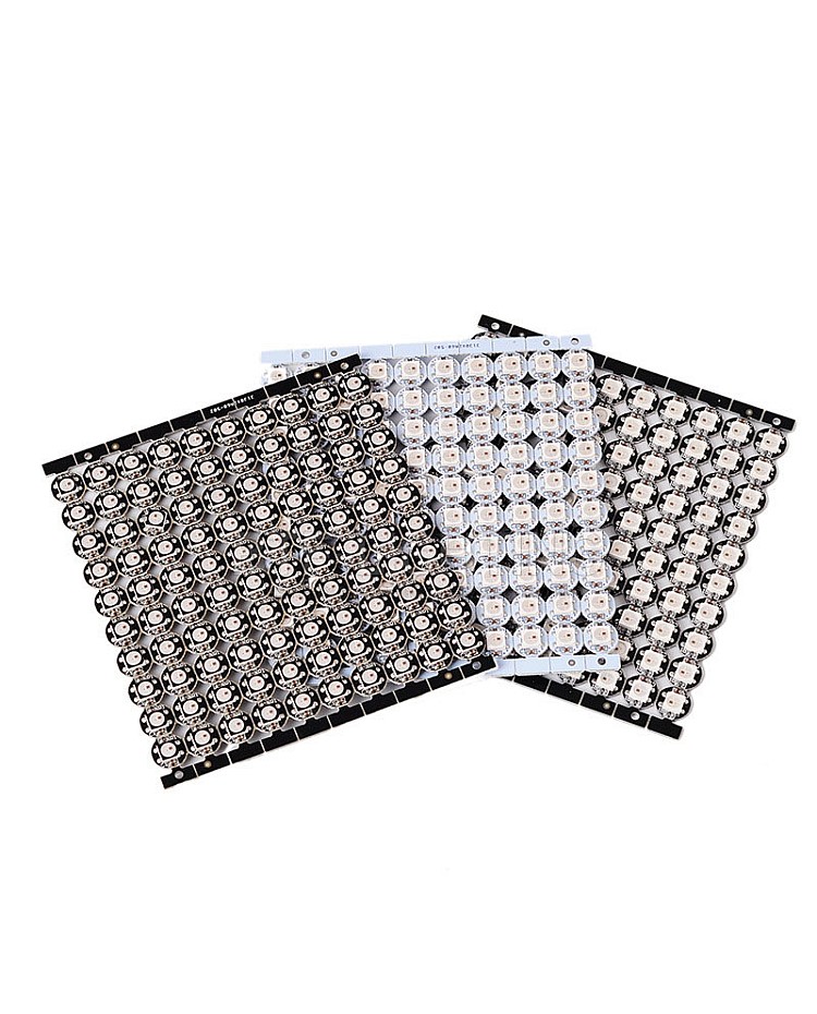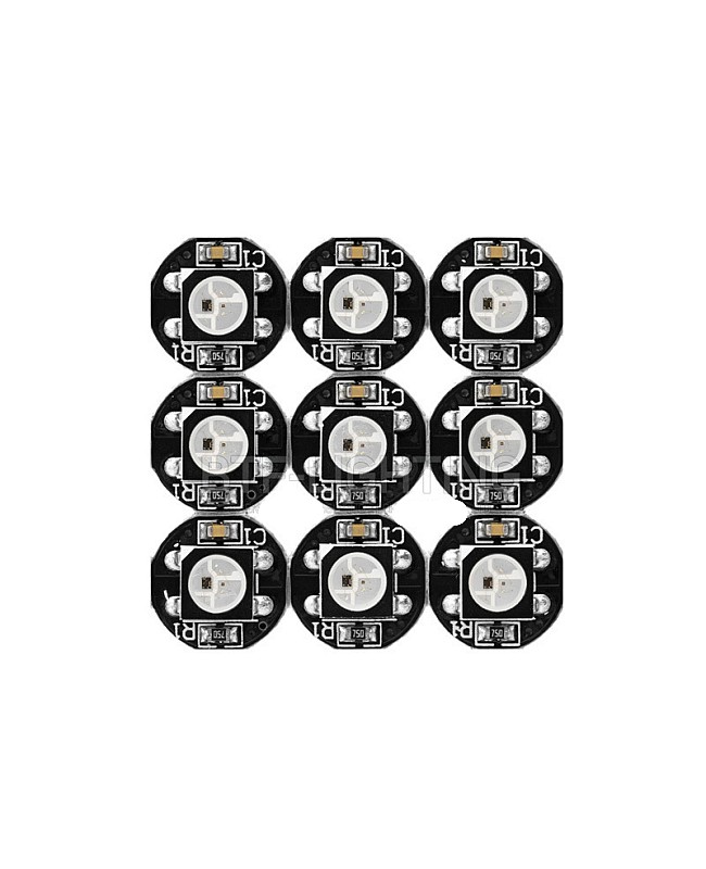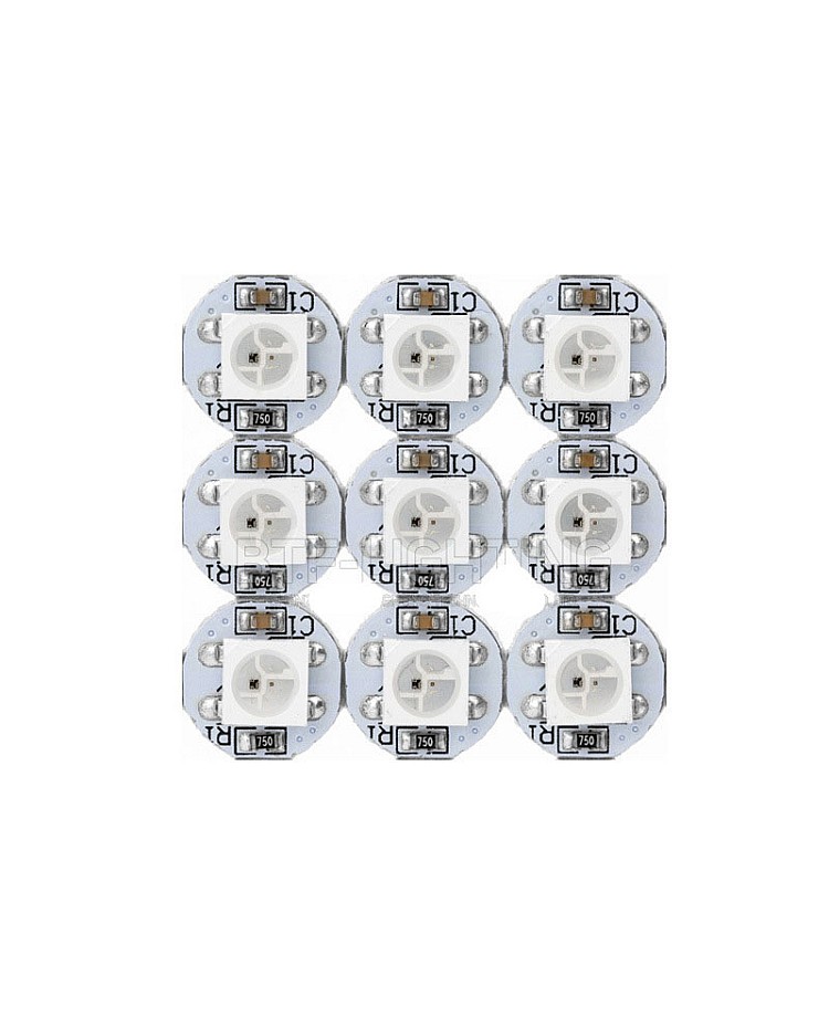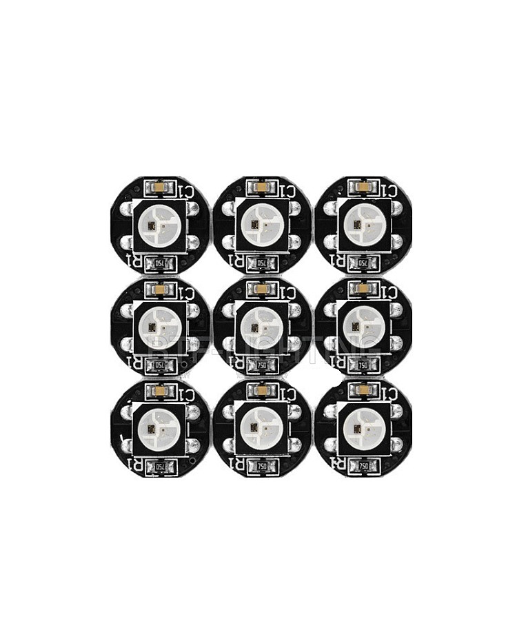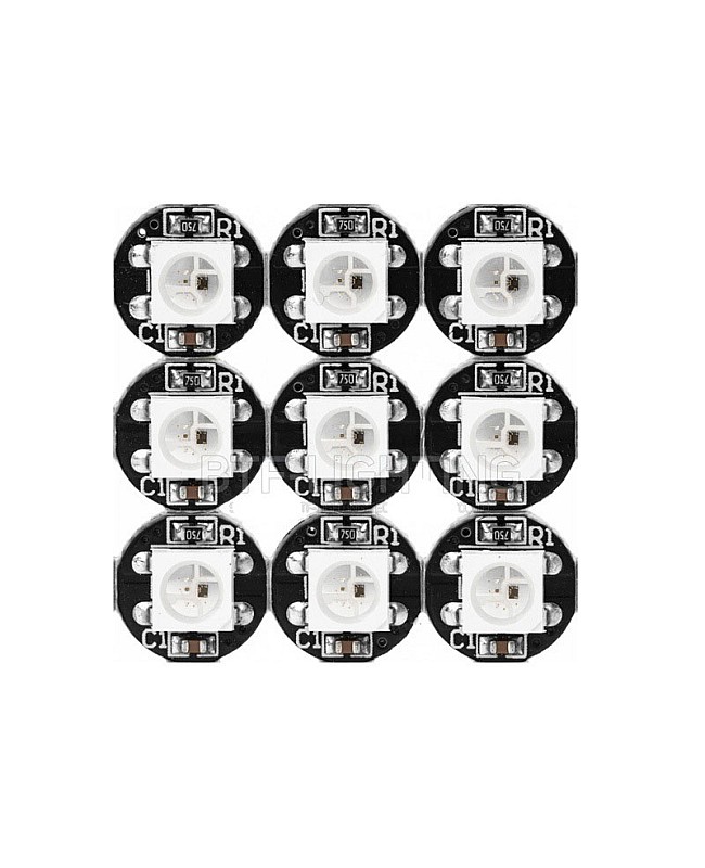 The WS2812B/SK6812 5050 RGB SMD LEDs with heat sink, built with an individually addressable IC, have a 256-brightness display and full 24-bit color display. The LEDs are mounted on a small round PCB board that allows for soldering where you want. The digital SMD LEDs are compatible with Arduino, Raspberry Pi, Teensy, T1000S, and K1000C programmable LED controllers to achieve many amazing lighting effects. None of the LEDs are connected through the PCB, and the user needs to solder them based on their requirement. There are 6 solder points on the backside.
